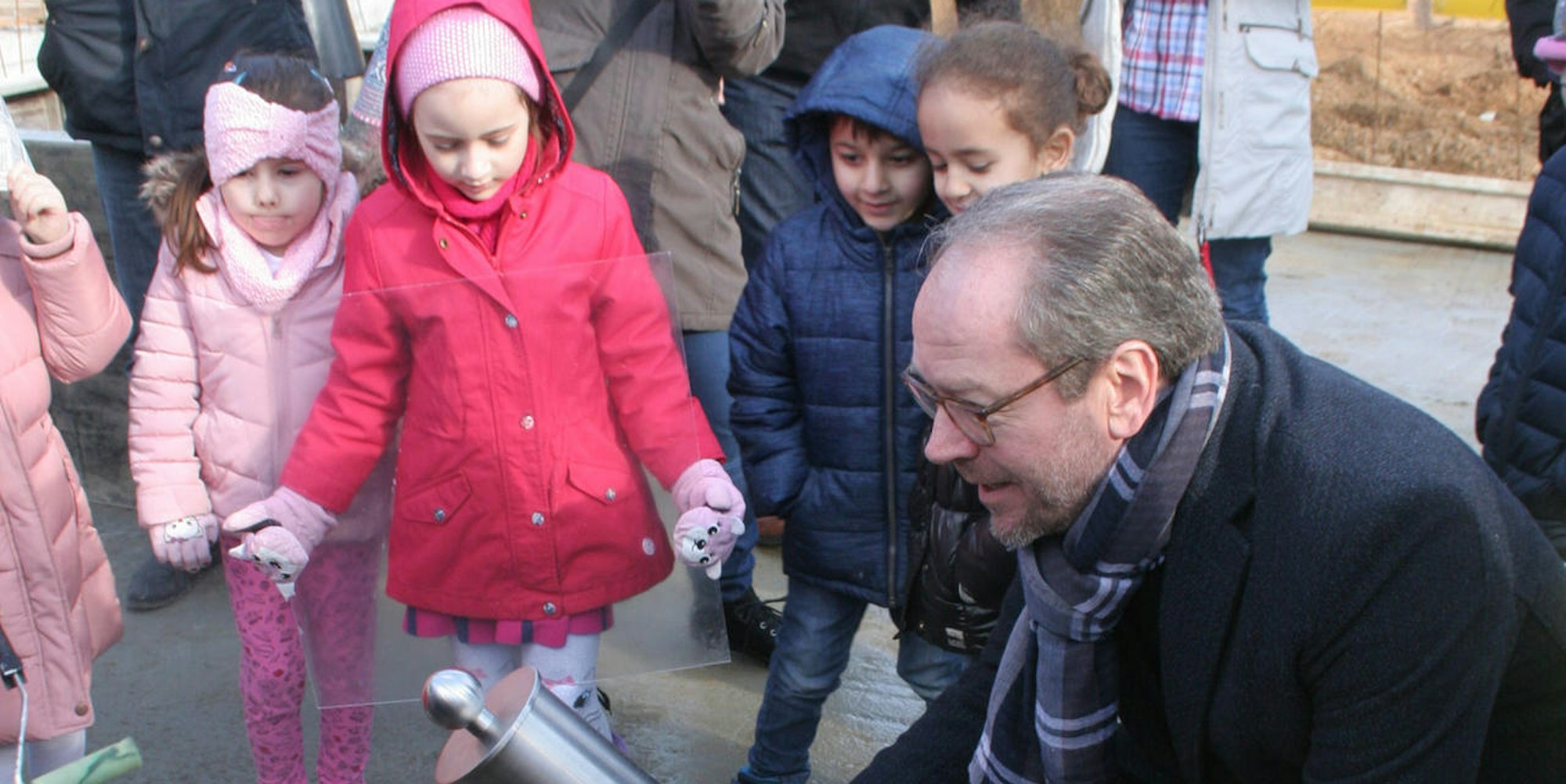 Gemeinsam mit Kindern der Kita Tigermaus aus Zieverich versenkte Bürgermeister Volker Mießeler eine Kapsel im Grundstein des künftigen Kindergartens an der Kennedystraße.