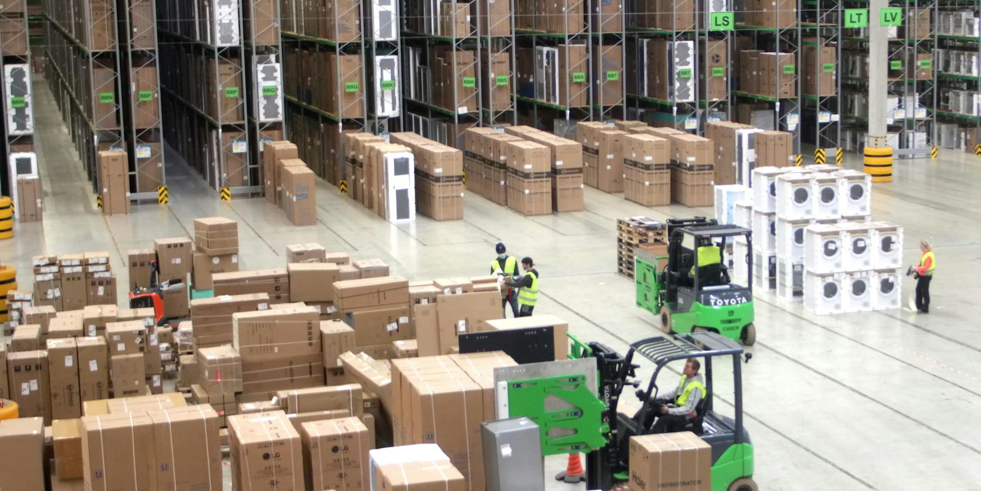„Das Großgeräte-Sortiment erfordert ein spezialisiertes Logistik- und Liefersystem. Immerhin schicken uns die Hersteller an manchen Tagen bis zu 5000 Einheiten, von den viele nach kurzer Verweilzeit gleich wieder ausgeliefert werden“, sagt Logistik-Chef Marcus Weiss. Die gut 150 logistischen Mitarbeiterinnen und Mitarbeiter in Bergheim sind an sechs Tagen in der Woche im Dreischichtendienst im Einsatz und müssen rund 70.000 Geräte im Blick behalten, die in Blöcken oder Hochregalen bis unters 13 Meter hohe Hallendach gestapelt sind.
