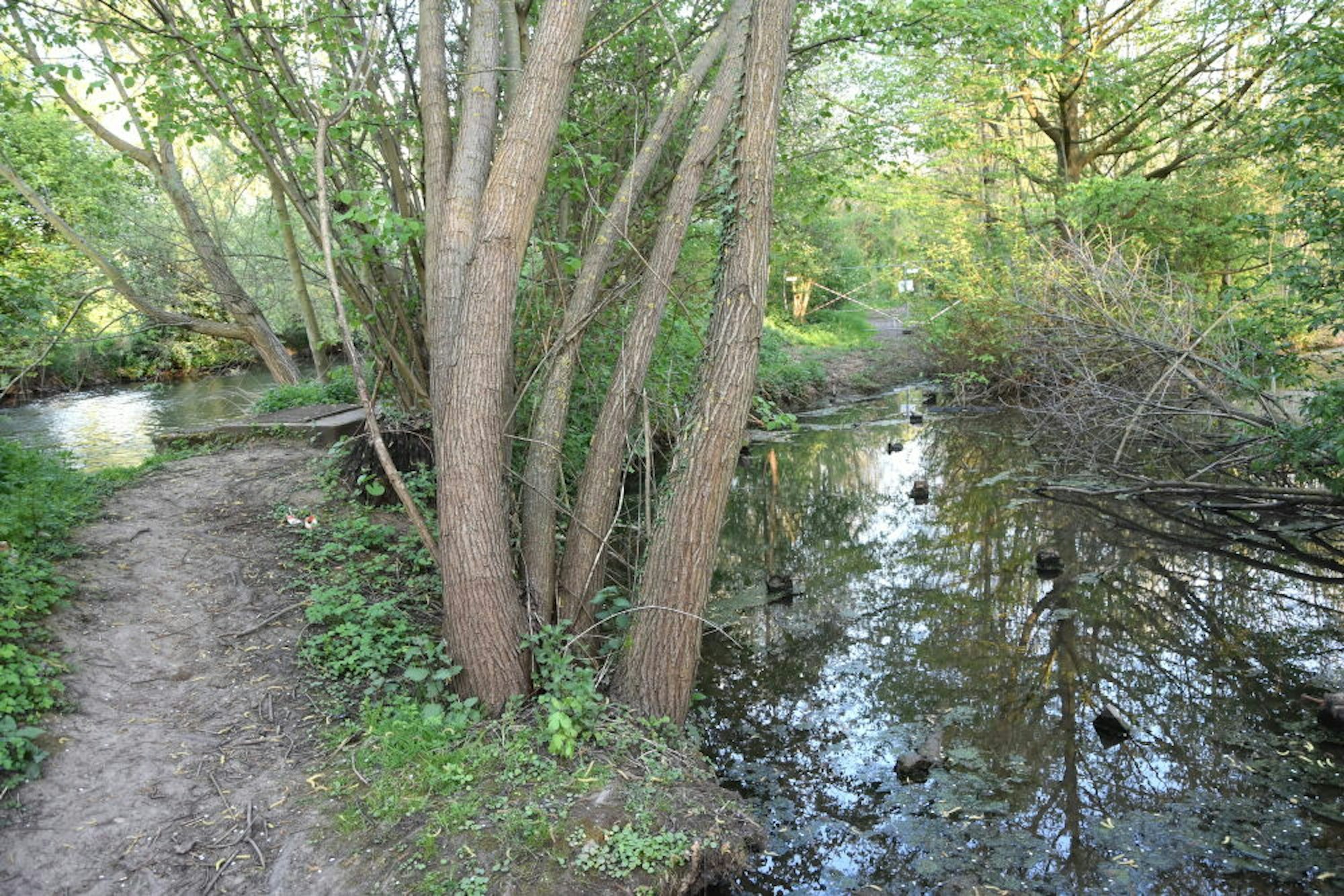 Nachdem vor zwei Monaten die hölzerne kleine Brücke über den Biotoptümpel abgebrochen wurde, ist der Wanderweg am Flussufer durch Bauzäune notdürftig versperrt. Wie ein Trampelpfad neben dem Bauzaun und auf der schmalen Dammkrone der Erft beweist, haben viele Spaziergängerinnen und Spaziergänger die Sperrung trotz Verbotsschildern umgangen.