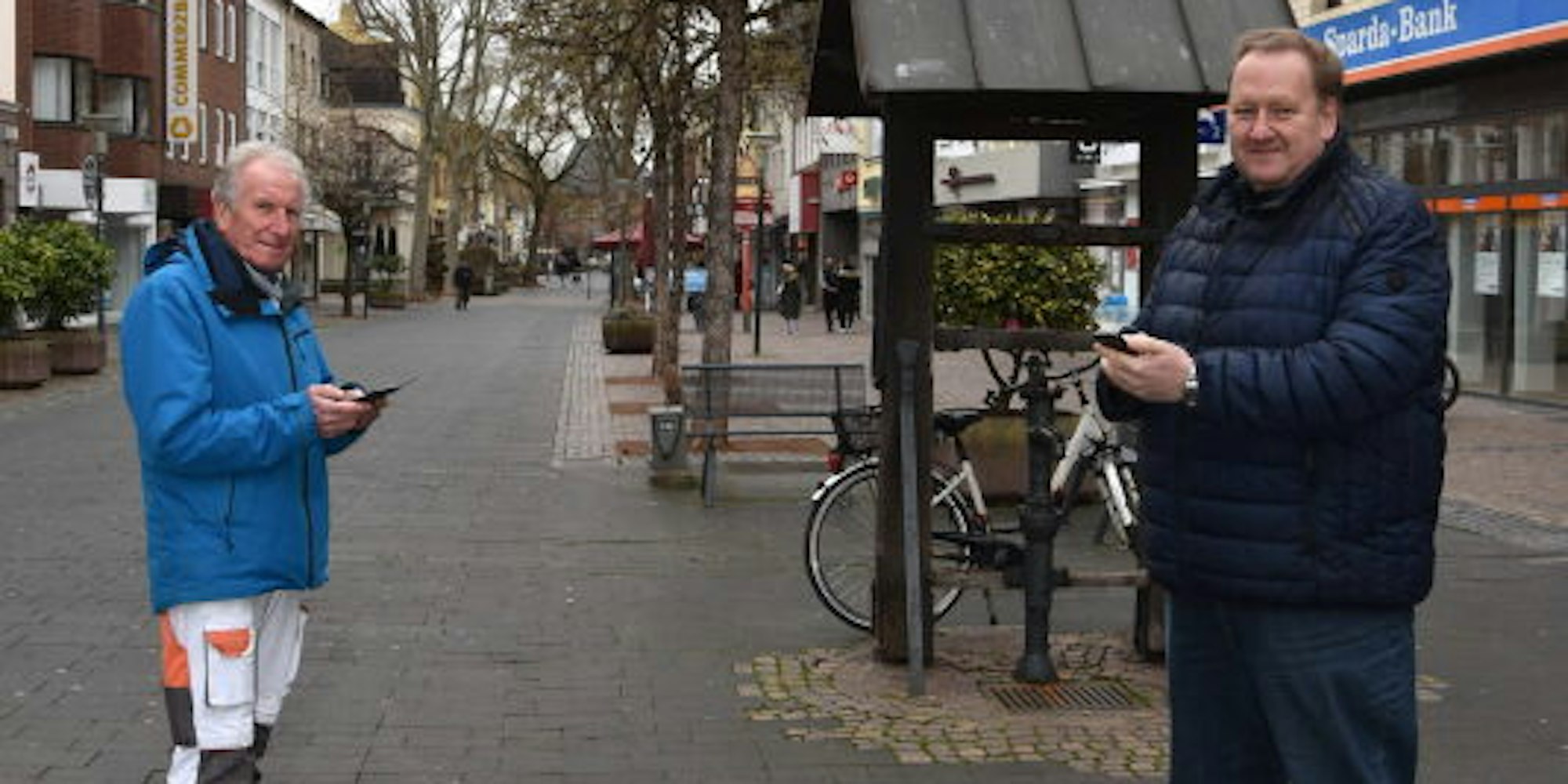 Nicht viel los an einem Lockdown-Vormittag in der unteren Fußgängerzone. Herman-Josef Falterbaum (l.) und Christian Karaschinski wollen dem mit einer lnternet-Plattform entgegenwirken.