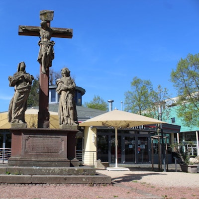 Bergheim – Der gekreuzigte Jesus und die neben ihm stehenden Maria und der Evangelist Johannes sind bereits entfernt. Am Mittwoch machten sich Bauarbeiter daran, den mächtigen Sockel des Replikats der Kreuzigungsgruppe Kalvarienberg an der Kleinen Erft in der Innenstadt abzubauen.