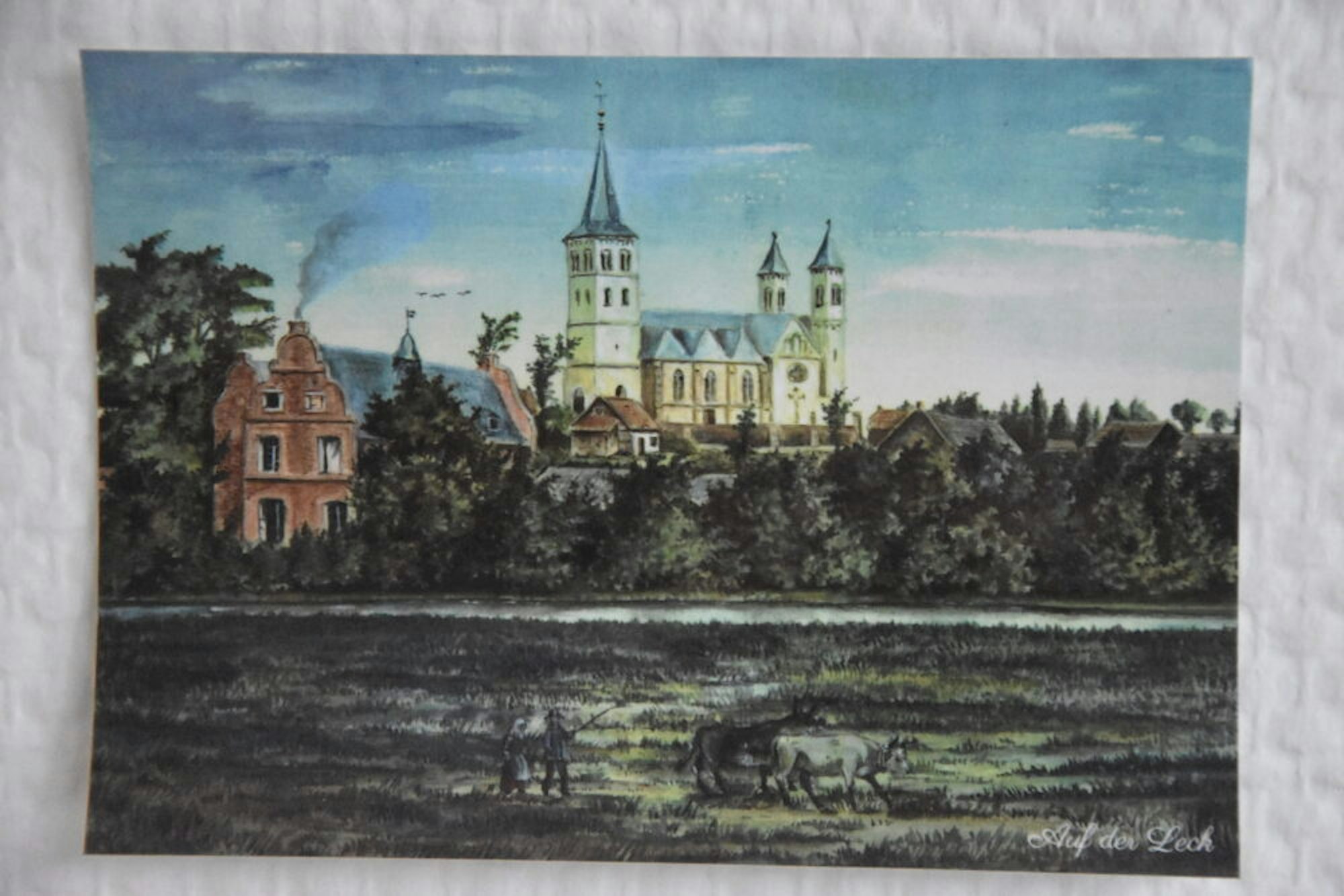Ein Aquarell von 1872, das das Haus Leck zu Füßen der St.-Remigius-Kirche zeigt.