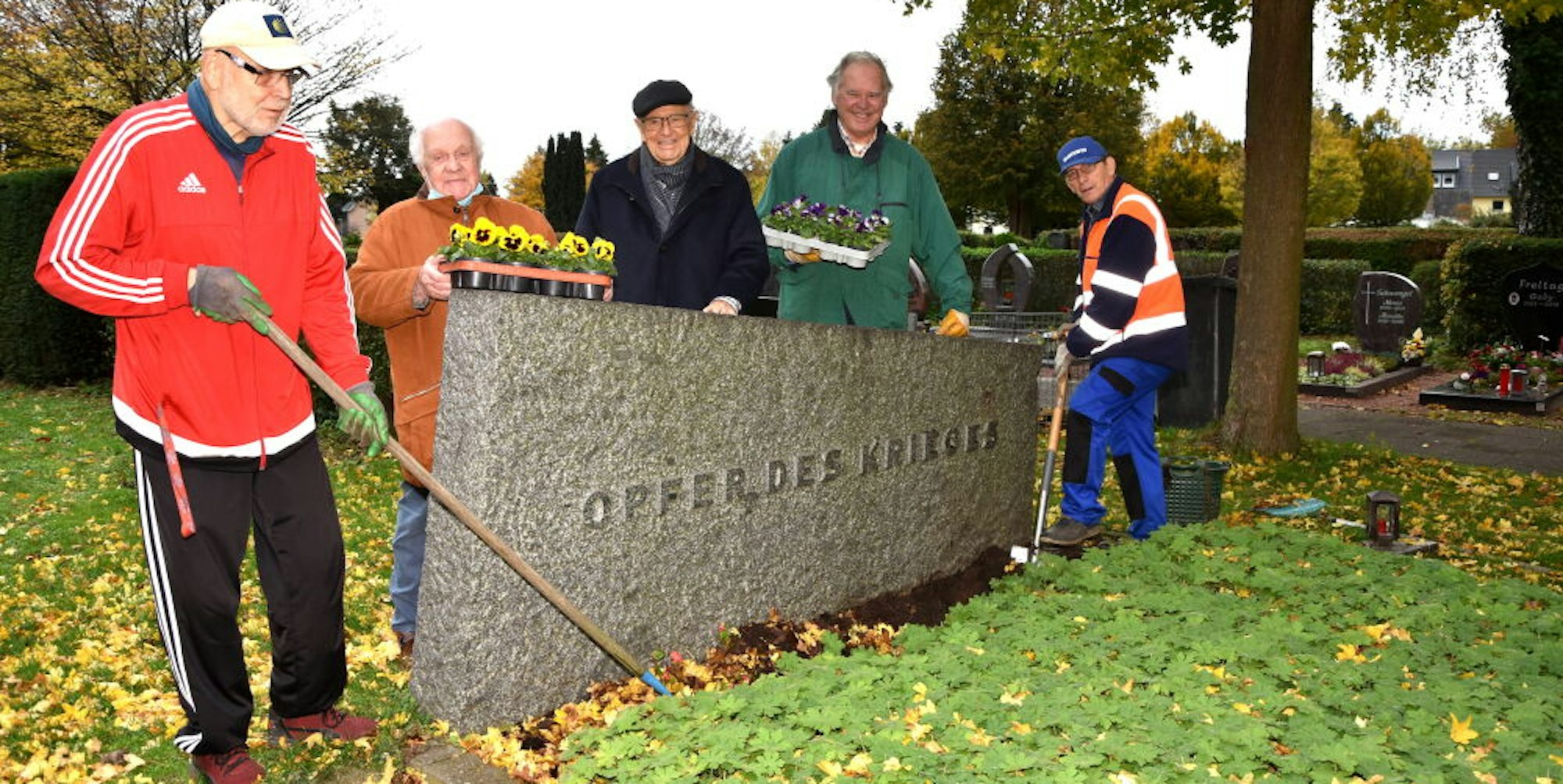 Seit zehn Jahren pflegen die Schützen um Johannes Hübner (grüne Jacke) die Ehrengräber auf dem Niederaußemer Friedhof.
