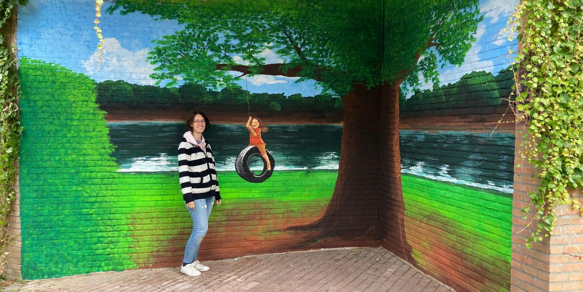 Bergheim – Eine Wand am Parkhaus an der Marienstraße hat die Künstlerin Ivonne Merkelbach neu gestaltet. Sie zeigt nun einen großen Baum, an dem eine Autoreifen-Schaukel hängt. Darauf schwingt sich ein Mädchen unter nur leicht bewölktem Himmel durch eine grüne Landschaft an einem Fluss. Ihr Bild in einer Nische am Parkhaus solle eine positive Stimmung vermitteln, sagt Merkelbach.