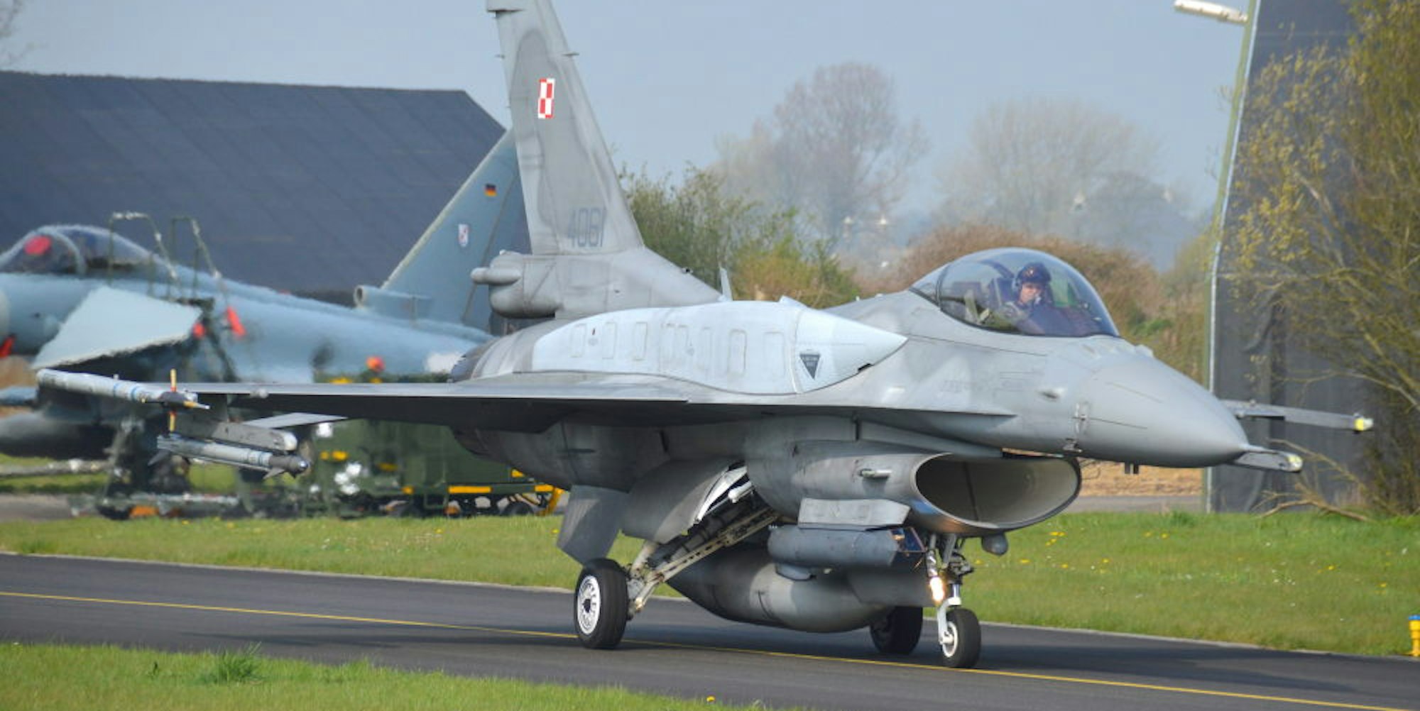 Drei Flieger des Typs F-16 (Vordergrund) der polnischen Luftwaffe waren bis Freitag zu Gast beim Taktischen Luftwaffengeschwader 31 „Boelcke“ in Nörvenich. Im Hintergrund ist ein Eurofighter des Nörvenicher Geschwaders zu sehen.