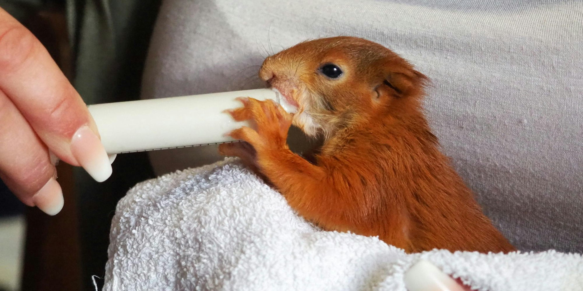 Mit Katzenaufzuchtmilch aus der Spritze werden die ganz jungen Fundtiere gefüttert. Dann geht das Training Schritt für Schritt weiter, bis die Tiere Nüsse knacken können.