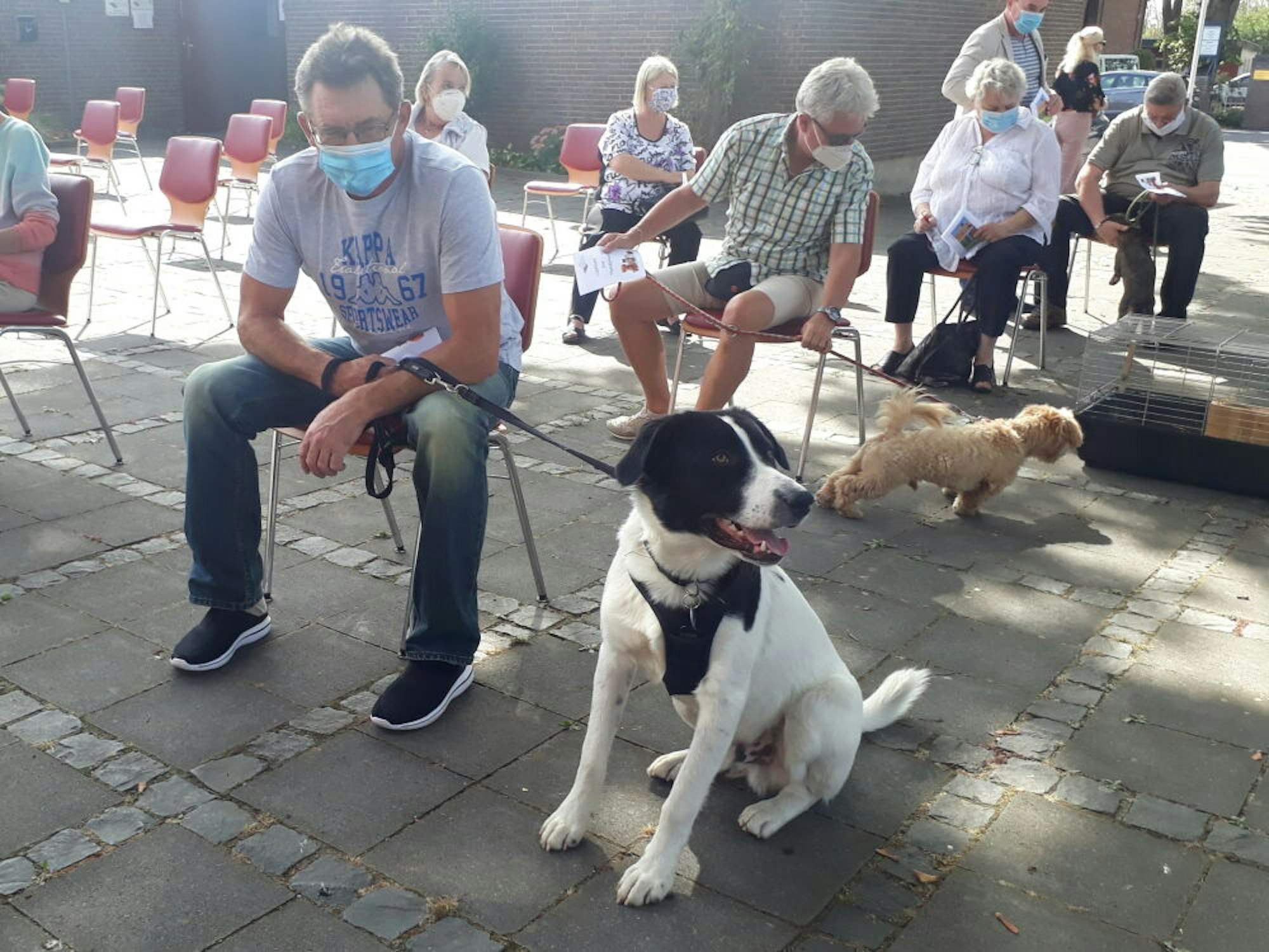 Bergheim – Die Stühle wurden ordnungsgemäß im 1,50-Meter-Abstand vor der Kirche aufgestellt. Der neue Organist , Michael Seibel, widmete sich der musikalischen Einstimmung, als um 13.45 Uhr Herrchen und Frauchen mit ihren Schützlingen eintrafen. Hunde, Katzen, Meerschweinchen und Kuscheltiere warteten brav auf den Segen von Pfarrer Michael König.