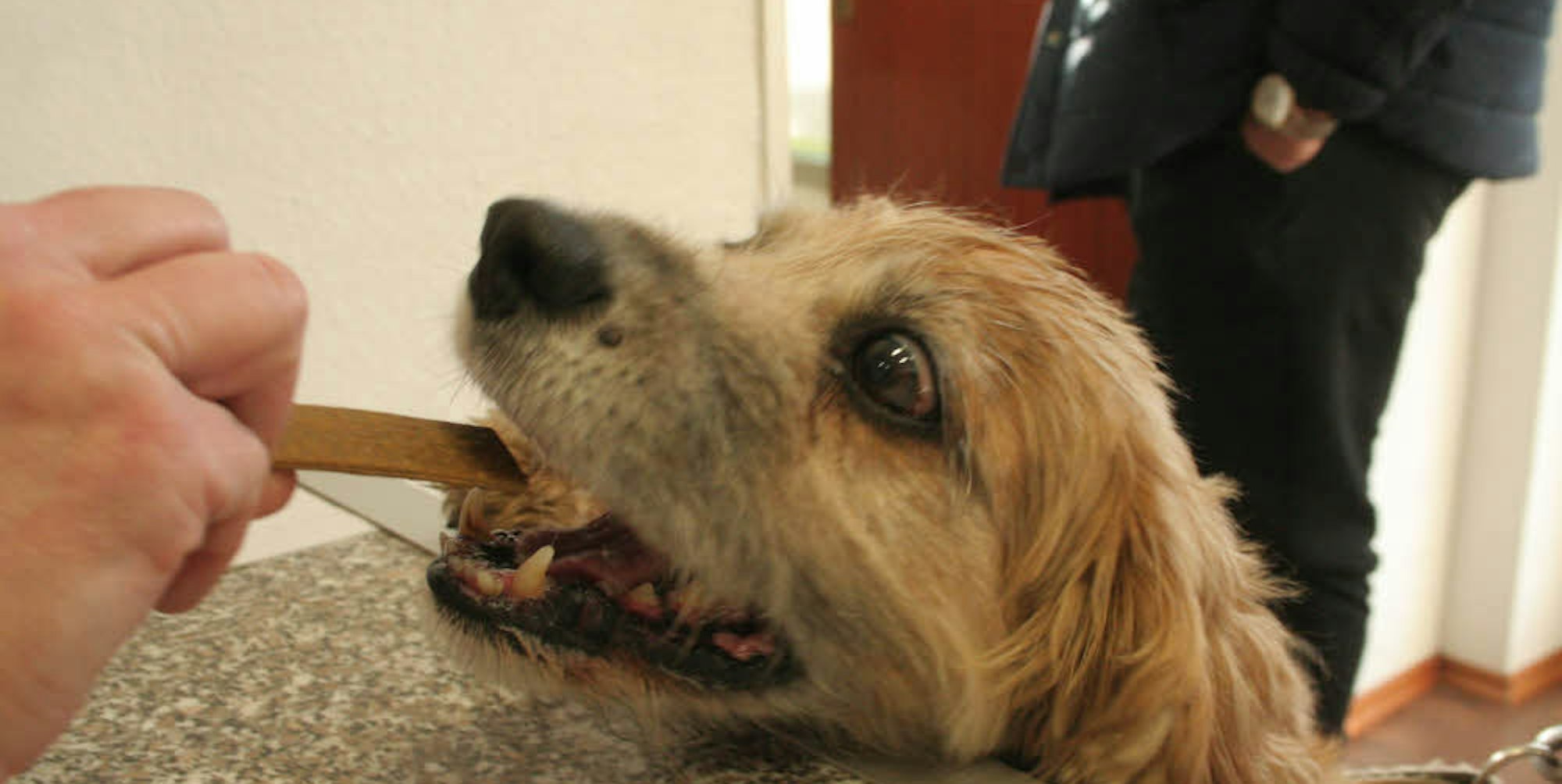Tobi darf naschen. Hunde, die mit ihren Besitzern bei der Tiertafel vorstellig werden, dürfen auf Futter an der Ausgabe hoffen.