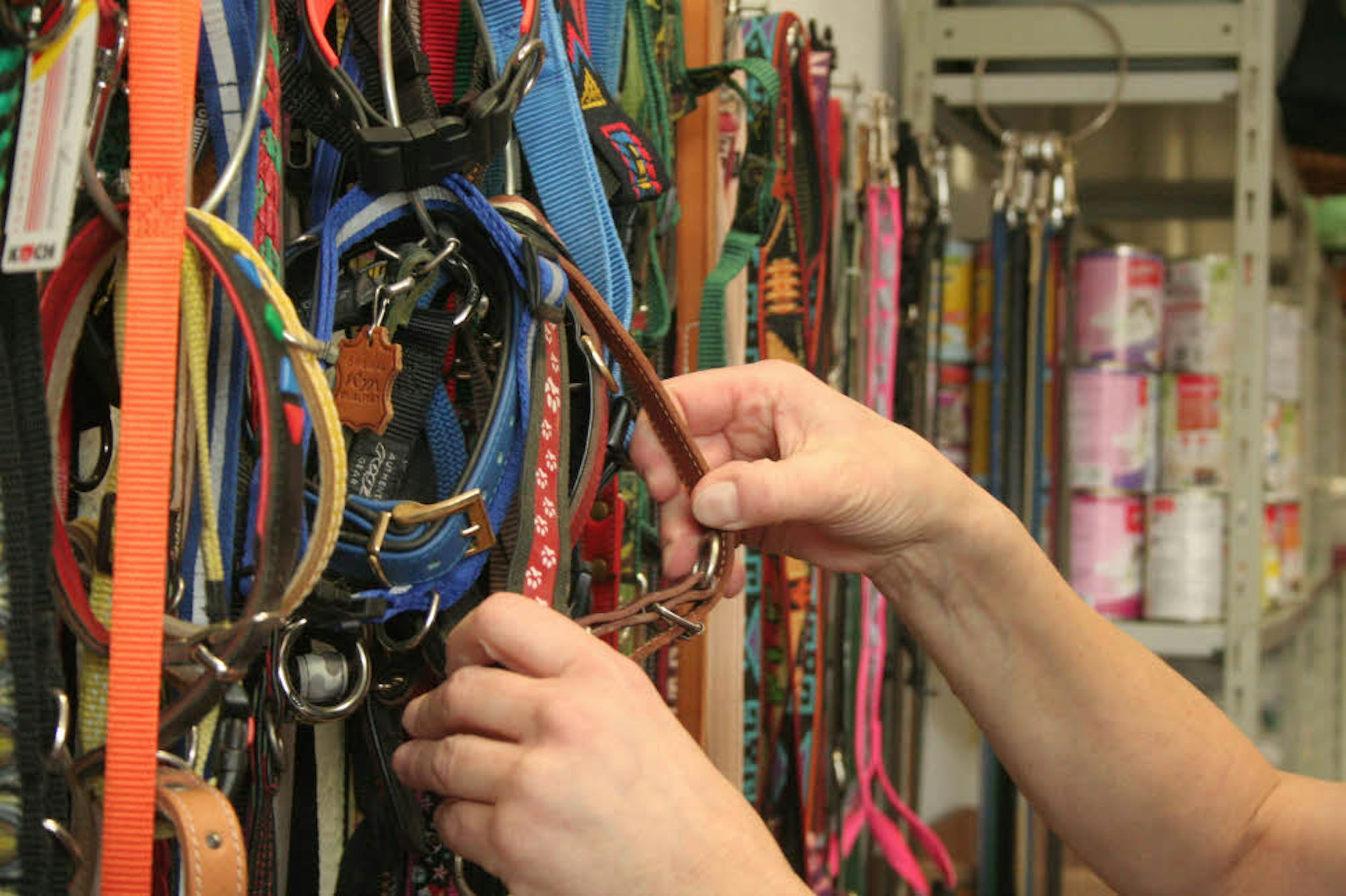 Die Auswahl an Leinen und Halsbändern für die Tiere ist groß.