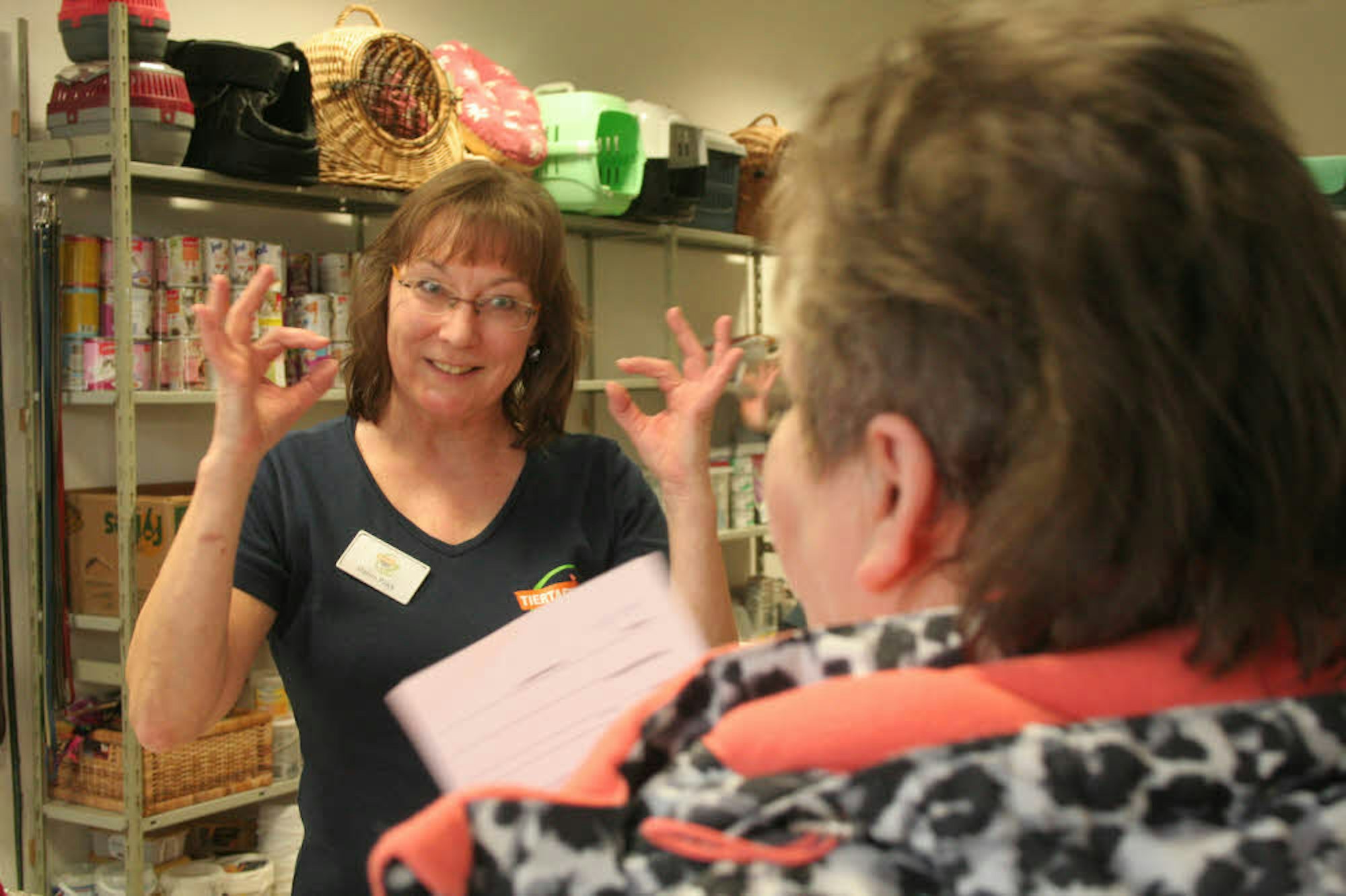 An der Futterausgabe wird es unruhig. Obwohl die Besitzer nur einzeln vorgelassen werden, geraten trotzdem zwei Hunde kurz aneinander. Es bleibt bei einem kurzen Bellen. Monika Plück von der Ausgabe gestikuliert dabei mit einer Kundin, ohne ein Wort zu verlieren. Sie spricht in Gebärdensprache, weil ihr Gegenüber taubstumm ist. Ein Kurs an der Volkshochschule macht die Kommunikation möglich.