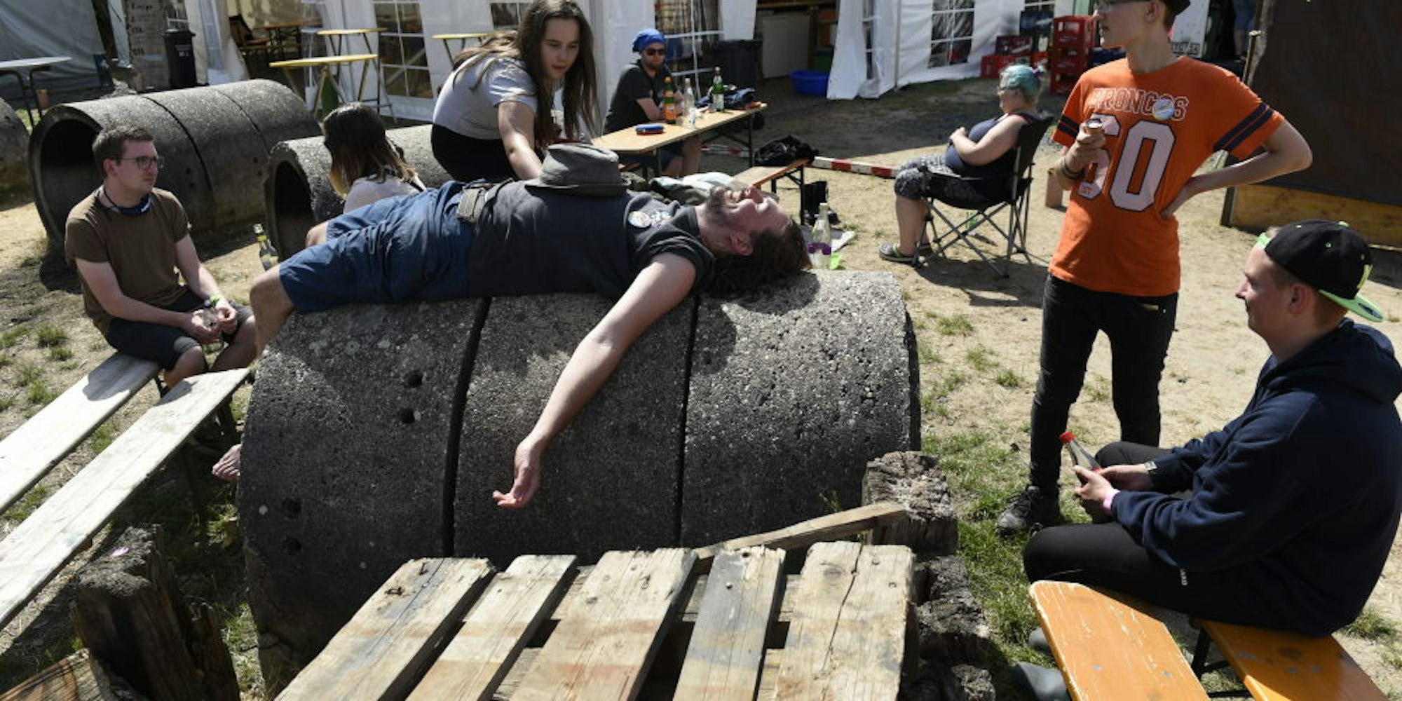 Bergheim-Paffendorf – Ein junger Mann names „Hut“, der so heißt, weil er ständig einen trägt, ruht am Freitagnachmittag mit ausgebreiteten Armen von der Nachtwache aus. In der Sonne liegt er auf einem der zunehmend verwitterten Kanalrohre rund um den Lagerfeuerplatz. Teilnehmer sitzen zusammen, plaudern, holen sich im großen Kneipenzelt was zu trinken – die Bionade lässt grüßen. Im Küchenzelt hört man allenfalls hinter der Plane ein Rumoren, bis zum Abendessen ist es noch weit.