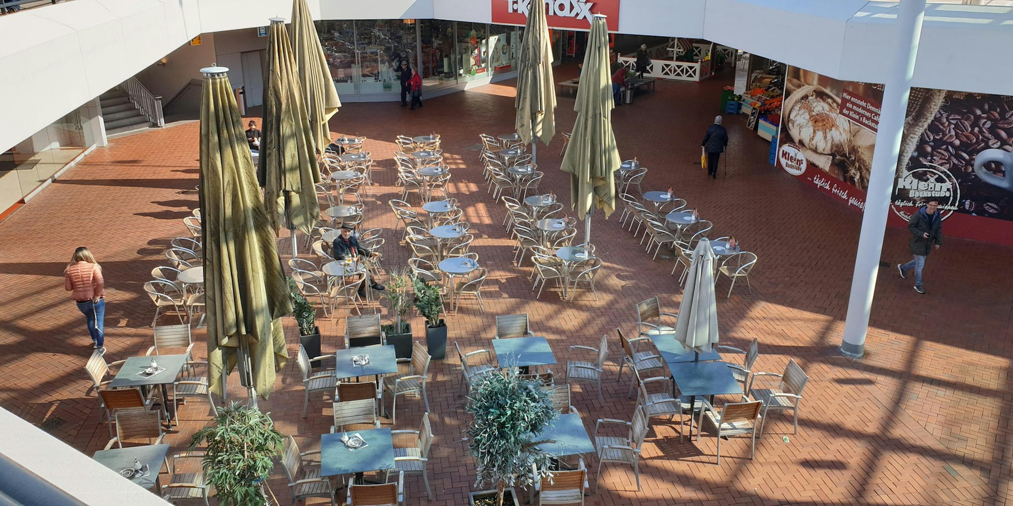 Auch an den Tischen vor der Schlemmermeile saßen einige Leute. Im Innern war die Hälfte der Tische gesperrt, damit der vorgeschriebene Abstand gewahrt werden konnte. Welche Geschäfte im Hürth-Park vom heutigen Mittwoch an noch geöffnet haben werden, hänge von den behördlichen Vorgaben ab, die von den Städten unterschiedlich umgesetzt würden, so die Center-Managerin. Danach werde entschieden, welche Geschäfte zur Grundversorgung weiterhin und zu welchen Zeiten geöffnet bleiben.