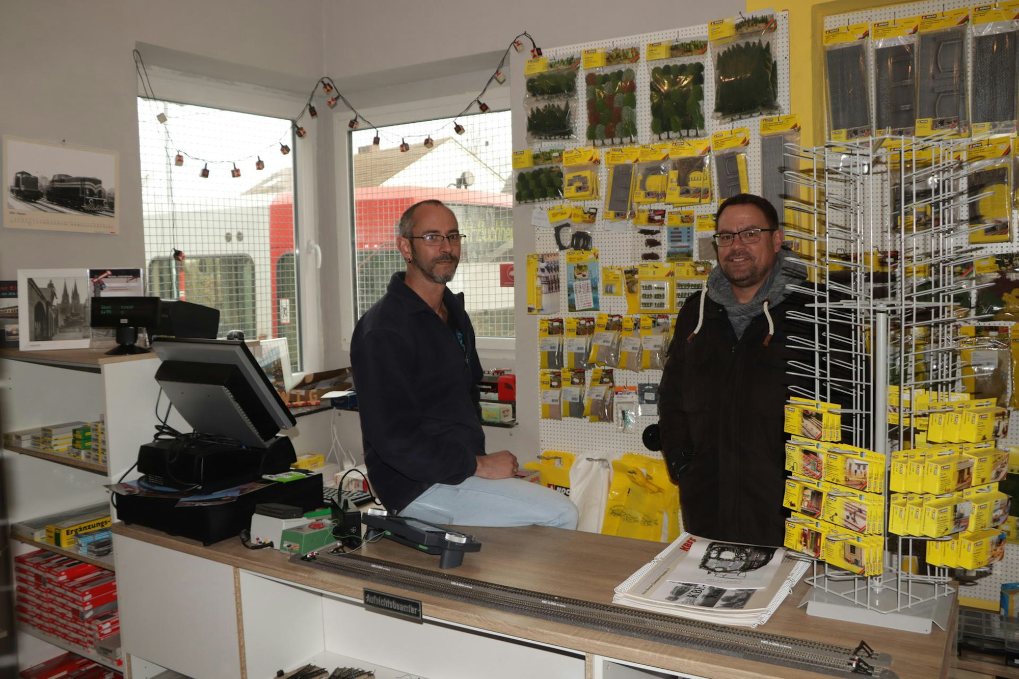 Dirk Collin und Thomas Ludwig (l.) im Fachgeschäft, das im Erdgeschoss des alten Bahnhofgebäudes eröffnet wurde.
