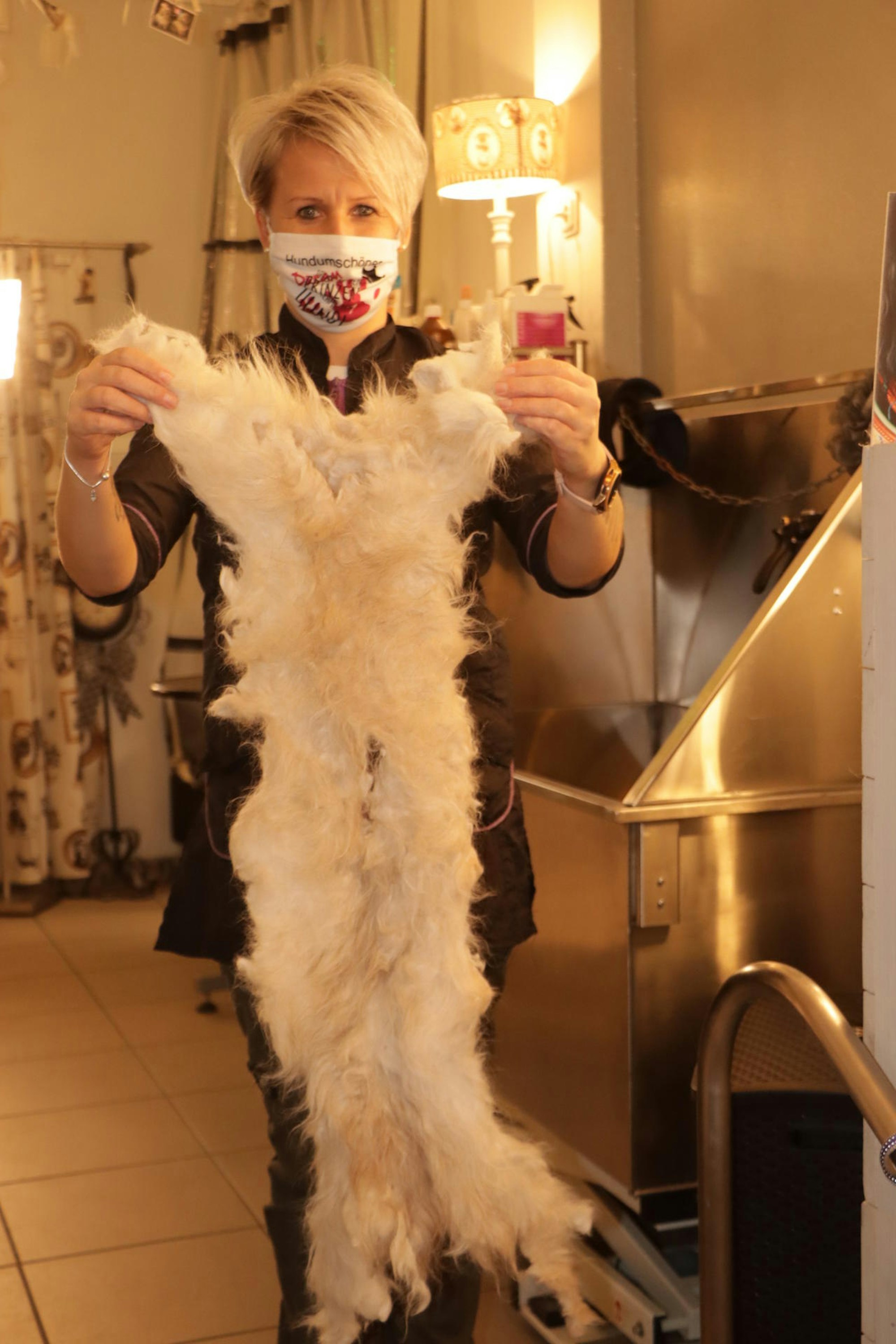 Retriever Max scheint die Blicke sogar zu genießen. Wie eine Statue steht der Rüde auf dem Frisiertisch, während Laumanns ihm zum Schluss noch die langen Haare kürzt. „Hier geht es nicht darum, aktuellen Modetrends nachzukommen“, erklärt sie. Für die Tiere sei es vielmehr eine Erleichterung, wenn ihre Unterwolle entfernt, ihr Fell gebürstet und je nach Rasse wieder kurz geschnitten sei. Ein häufiges Problem sei nämlich, dass das Fell verfilzt. „Auch die Unterwolle kann verfilzen“, erklärt die 54-Jährige.