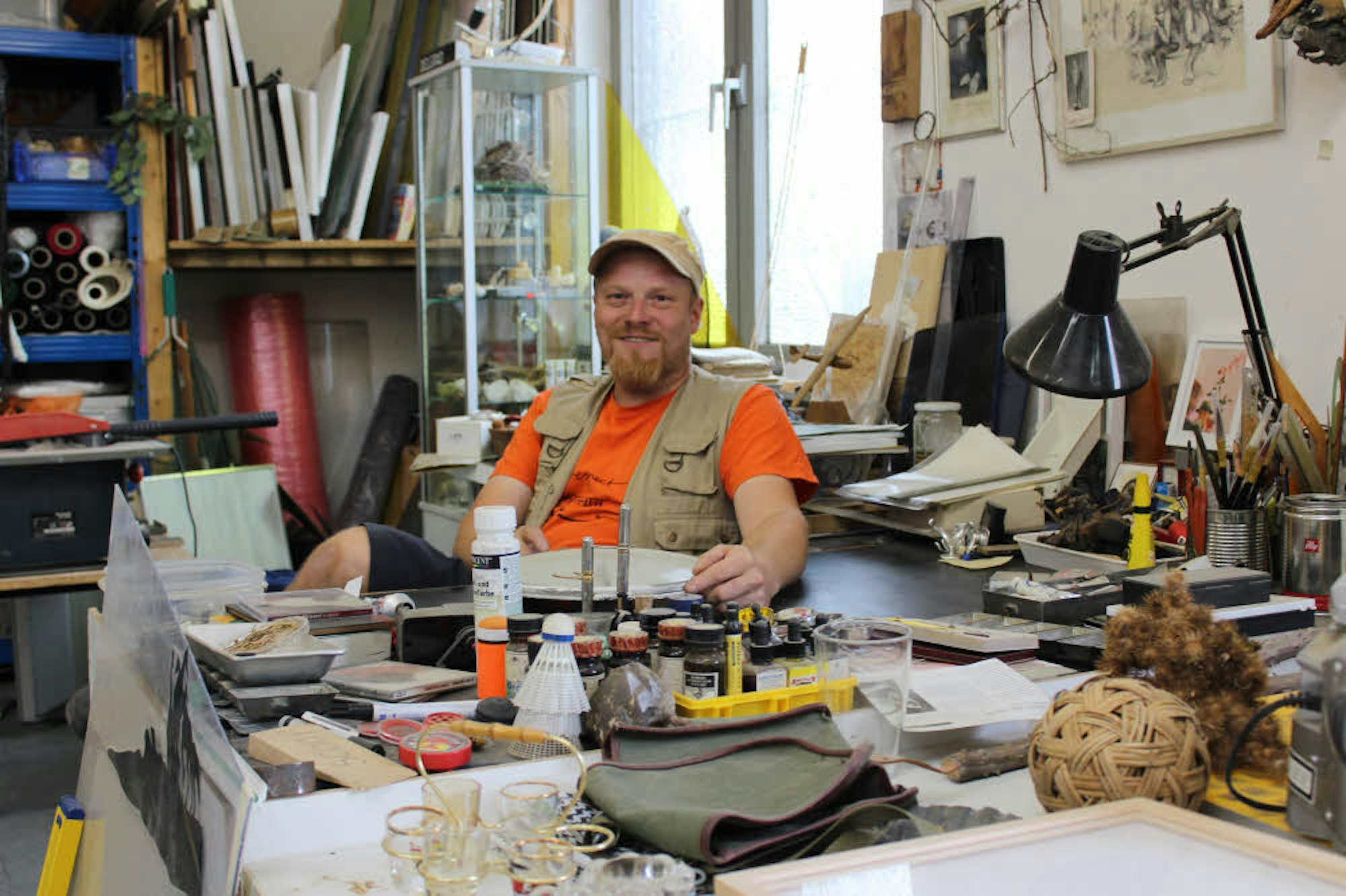 Andreas Gehlens großzügiges Atelier ist hingegen eine Art Experimentierwerkstatt, die vollgestopft ist mit unterschiedlichsten Fundstücken und Sammlungsobjekten, die bei Installationen zum Einsatz kommen können. Gehlen, der im Brotberuf Kunstfels-Anlagen etwa für zoologische Gärten errichtet, taucht hier „ins Filigrane ein“ und genießt den Wechsel zwischen den unterschiedlichen Arbeitsfeldern.