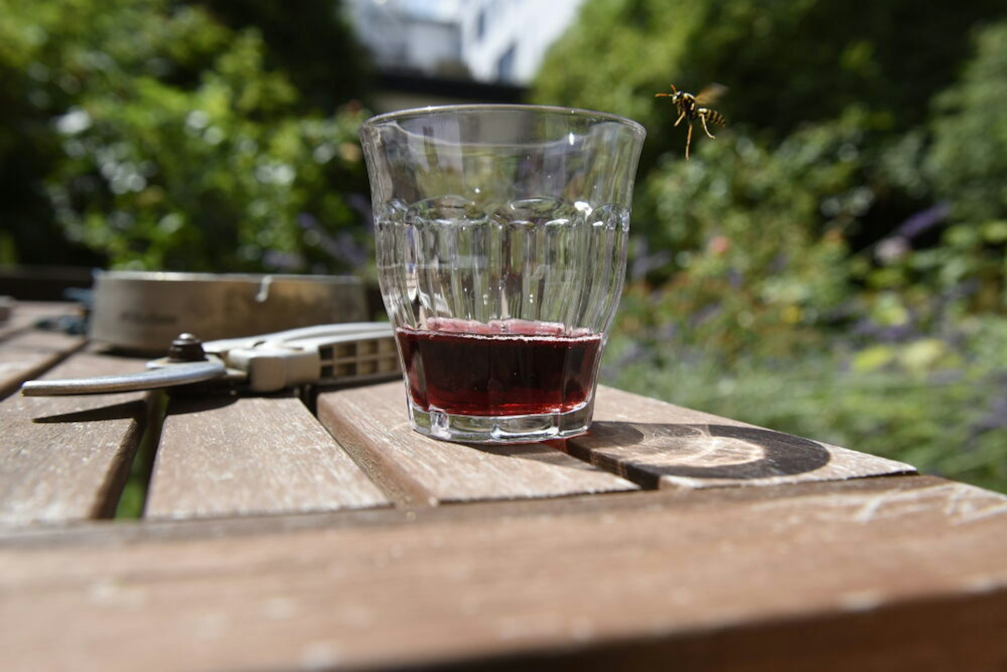 Abraham Darby blüht immer noch. Eine Haus-Feld Wespe im Anflug auf das Saftglas. Gurken werden auch geerntet.