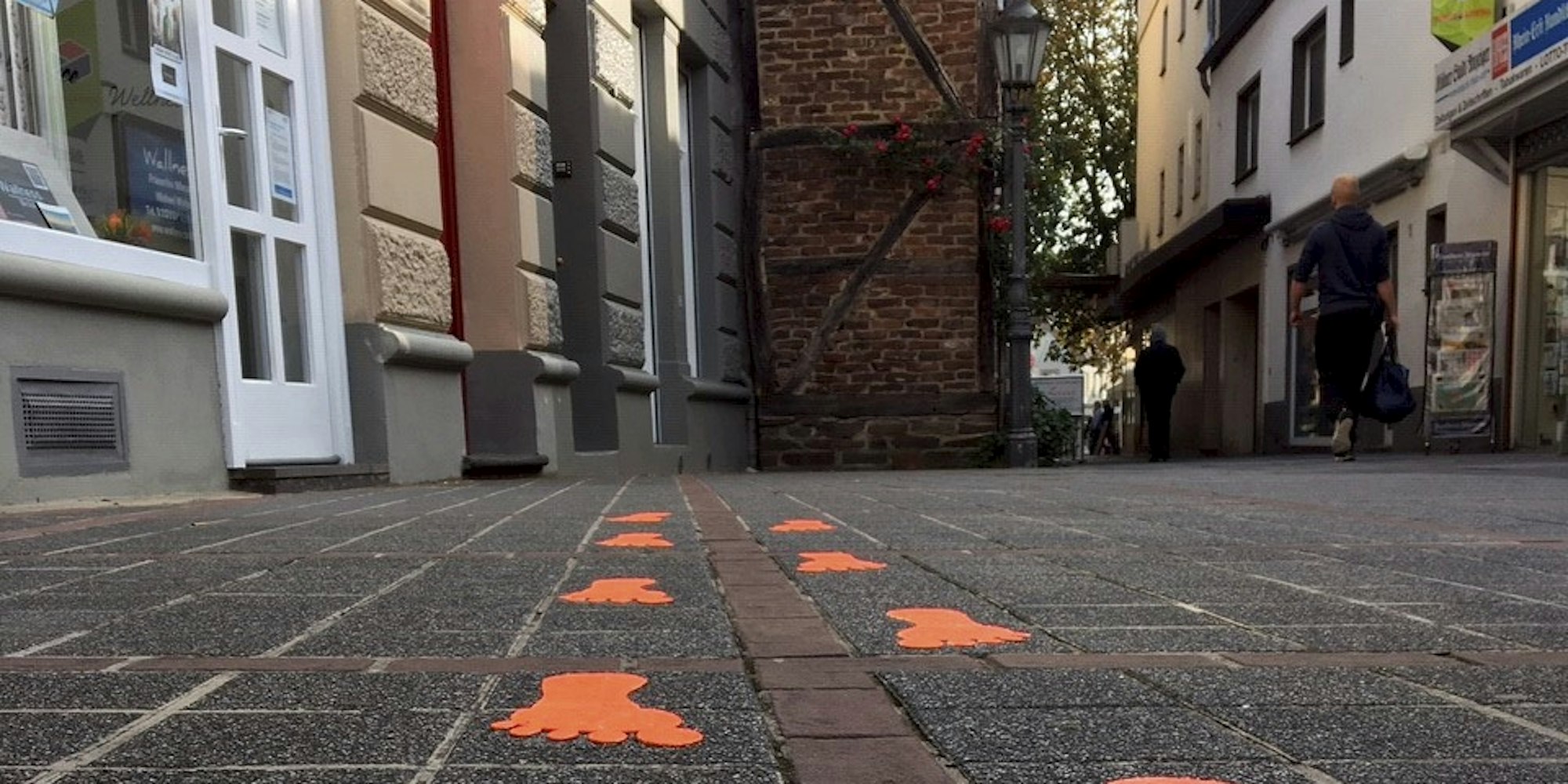 Brühl – Die frisch aufgebrachten orangefarbenen Fußstapfen auf dem Pflaster der Kirchstraße sind ein sichtbares Zeichen: Das Projekt „Bespielbare und besitzbare Stadt“ kommt wieder in Schwung. „Coronabedingt kam es zu Verzögerungen. Jetzt geschieht wieder einiges“, sagt Michael Schulz, Fachbereichsleiter für Infrastruktur und Tiefbau bei der Stadt.