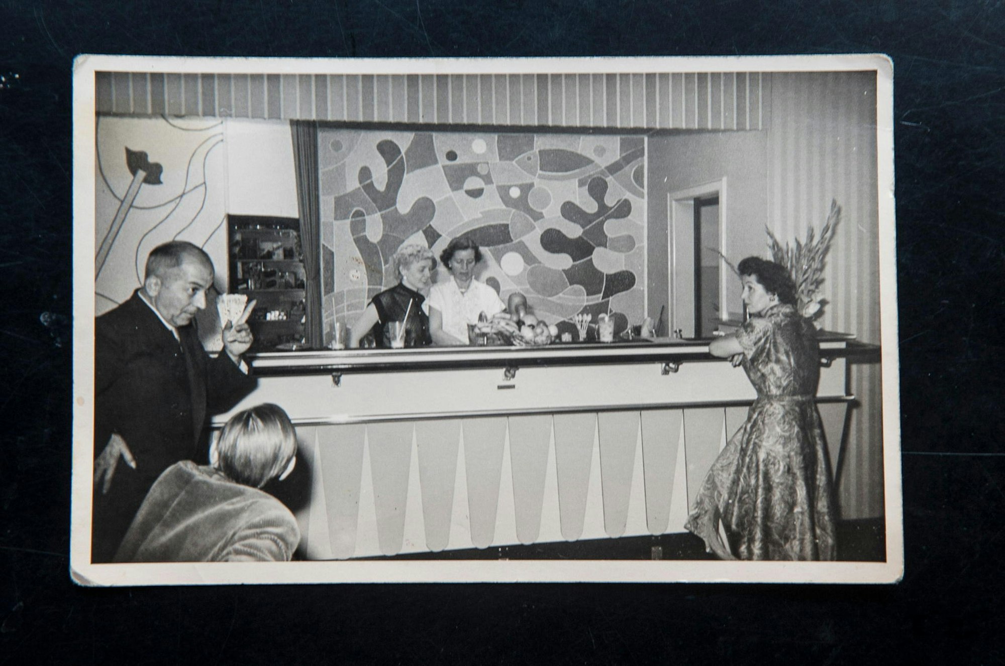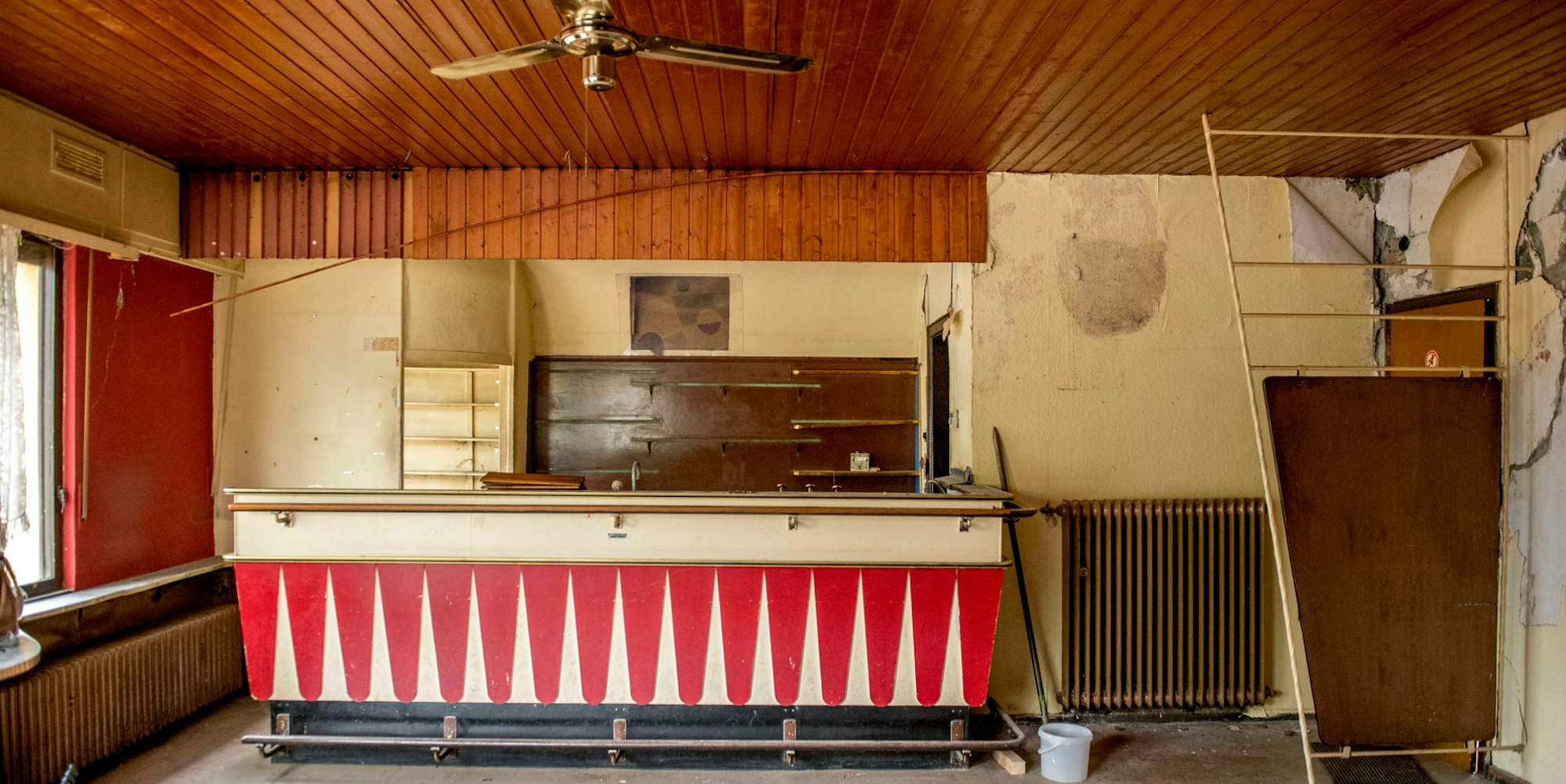 Sehr spannend sei die Entdeckung des Wandgemäldes über dem Thekenbereich, das auf den alten Schwarz-Weiß-Fotos gut zu sehen gewesen sei. Vermutlich in den 1965er-Jahren sei es hinter einer halbrund angelegten Wandverkleidung einer dünnen, leicht formbaren Pressspanplatte verschwunden. Der gefälligen Unterwasserwelt, ganz im Stil der damals vorherrschenden Nierentisch-Ornamentik, sei man zu dem Zeitpunkt wohl überdrüssig geworden, sagte Vorwig. Aber man habe das Wandgemälde des Brühler Malermeisters Vogel bei allem Modernisierungswillen, dennoch mit viel Respekt behandelt und es nicht etwa durch Übermalung zerstört. Auch im Deckenbereich habe man unter der Abhängung eine recht fragile Strukturmalerei entdeckt, die wie die Imitation eines Stabparketts wirke.