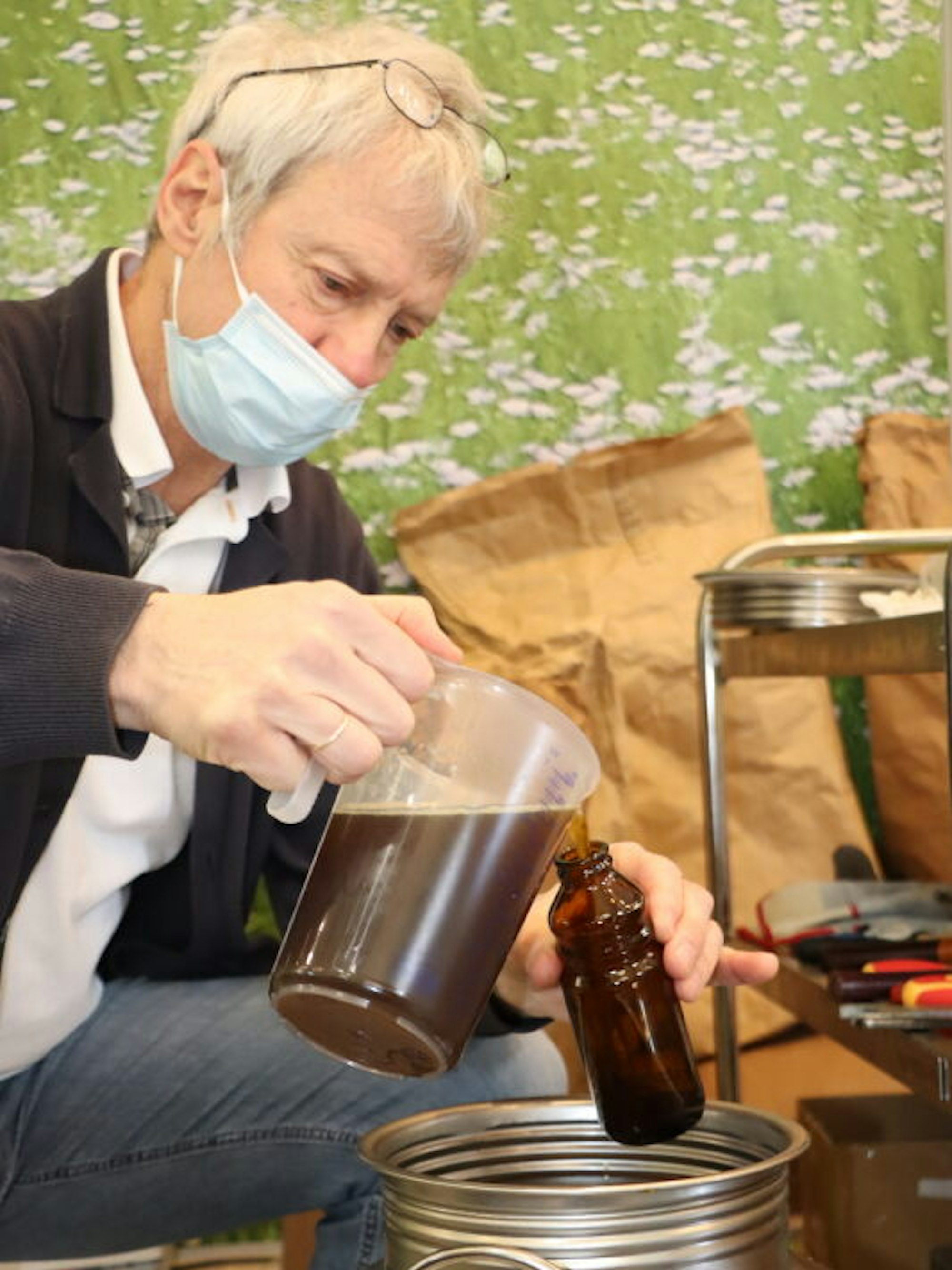 Peter Thole füllt das frisch gepresste Leinöl in die Flasche um. Früher hat er an einer Hochschule unterrichtet,