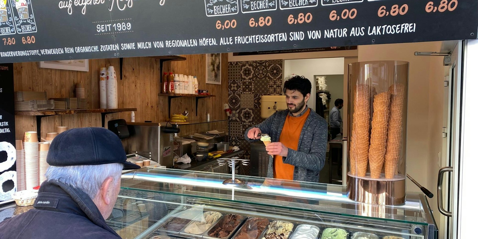 Bei einigen Zutaten greife man auf biologisch erzeugte Lebensmittel zurück. Vieles kaufe man in der näheren Umgebung ein. Daher setzt der 37-Jährige auch auf saisonale Angebote. „Wenn die Erdbeeren auf den Feldern der Umgebung reif sind, werden wir uns sicherlich etwas Besonderes einfallen lassen. Im Herbst gibt es dann Nuss-Kreationen“, sagt er. Die klassischen Eiskugeln kosten 1,20 Euro. Zudem gibt es Eisbecher.