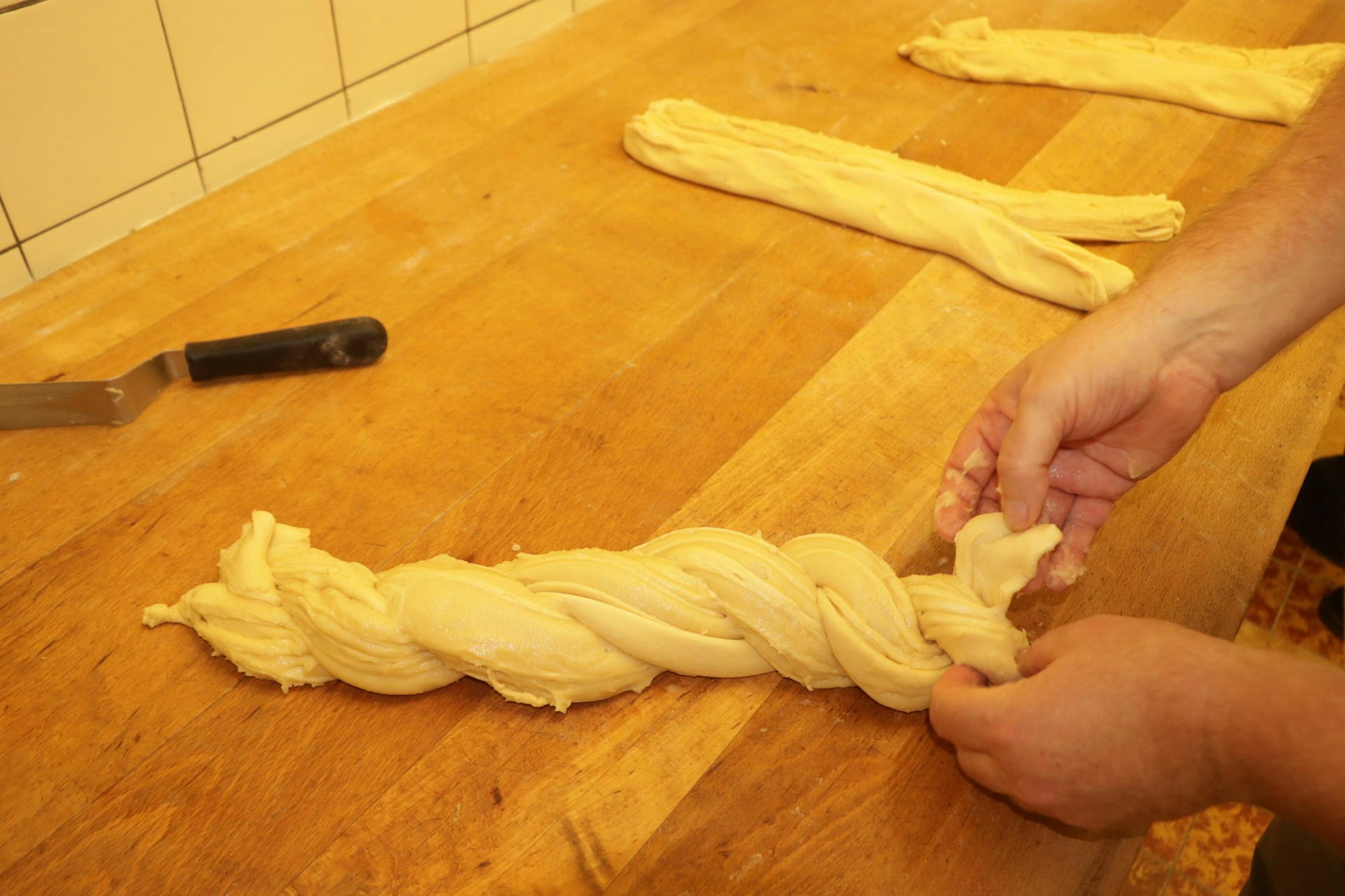 Aus drei dieser Würste werden anschließend lange Zöpfe geflochten. Dabei müssen Belzer und Giesbach sehr genau darauf achten, dass die Zöpfe in der Mitte etwas dicker sind als an den beiden Enden.
