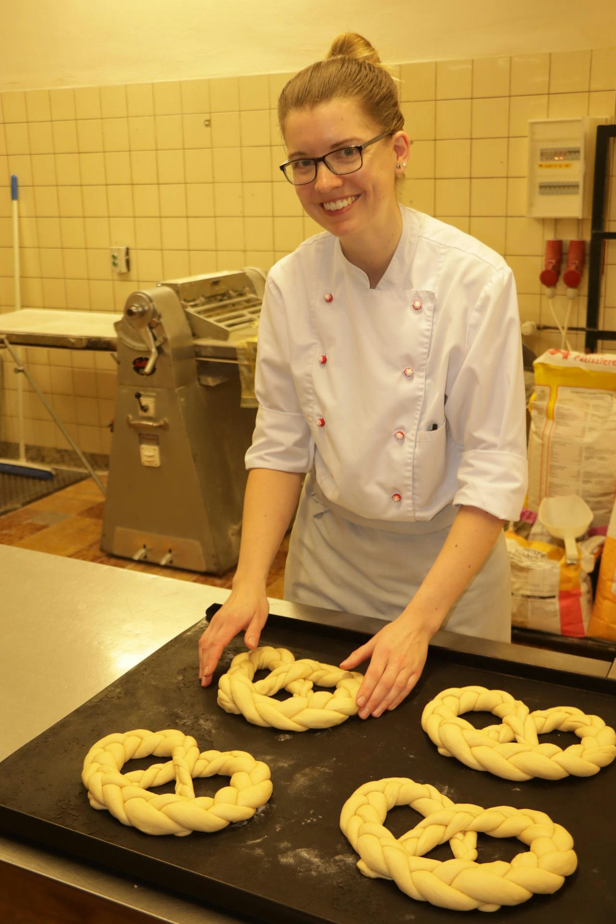 Hand in Hand mit ihrem Chef drehte und formte Konditor-Meisterin Christina Gielsbach rund 100 Neujahrsbretzeln.