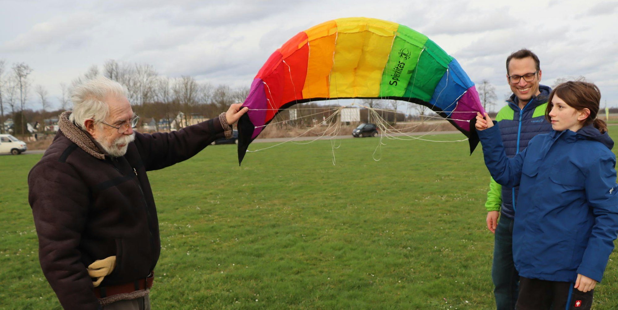 Zufällig waren auch Liron (11) und sein Vater Joscha Vogt aus Brühl auf der Wiese – natürlich mit einem Drachen. Begeistert spitzten sie die Ohren, als Klein sie in die Geheimnisse des Drachensteigenlassens einweiht. Beim Einleiner, also einem Drachen der an nur einer Leine befestigt ist, müsse darauf geachtet werden, diesen im Strom des Windes aufsteigen zu lassen – weit weg von Gebäuden, Bäumen oder kleinen Wäldern. Diese könnten zu Verwirbelungen des Windes führen. „Und dann bekommt man den Drachen nicht hoch“, so Klein. Liron hatte einen Lenkdrachen dabei und der steigt dann auch mit Kleins Unterstützung problemlos in die Luft.