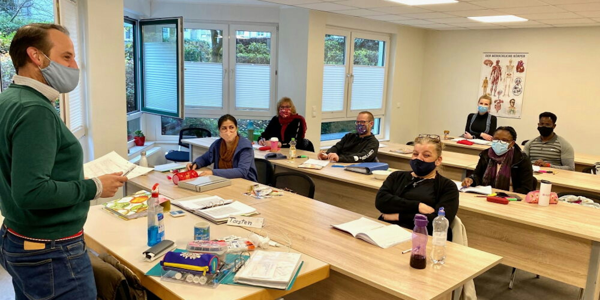 Dennis Külpmann (l.) unterrichtet am Pflegekolleg Brühl Auszubildende, die Pflegehelfer werden wollen.