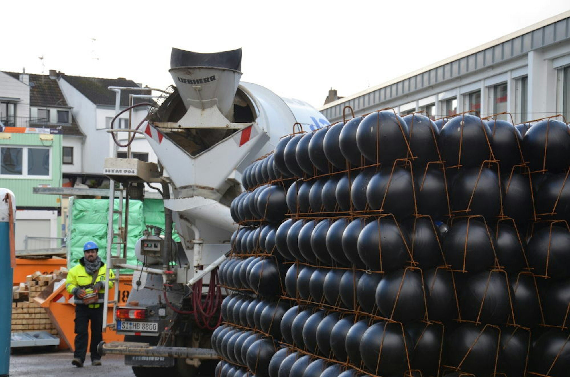 Auf der wohl bekanntesten Baustelle der Stadt arbeiten derzeit Tag für Tag 16 bis 18 Mann. Diese sind im Moment damit beschäftigt, die 45 Zentimeter dicke Decke des Erdgeschosses zu errichten. Dass der Beton dabei zwischen kopfgroße schwarze Kunststoffbälle gegossen wird, ist für die Arbeiter nichts Neues, wohl aber für viele Passanten, die dabei zusehen. „Wir werden immer wieder angesprochen, wofür die Bälle gedacht sind“, sagt Marcus Hollmann. Der Bauingenieur, der im Gebäudemanagement des Stadtservicebetriebs tätig ist, kann Aufklärung leisten. „Mit den Bällen entsteht eine sogenannte Cobiax-Hohlkörperdecke. Diese ist leichter, weil weniger Beton verwendet werden muss, um das gleiche Volumen zu füllen.“