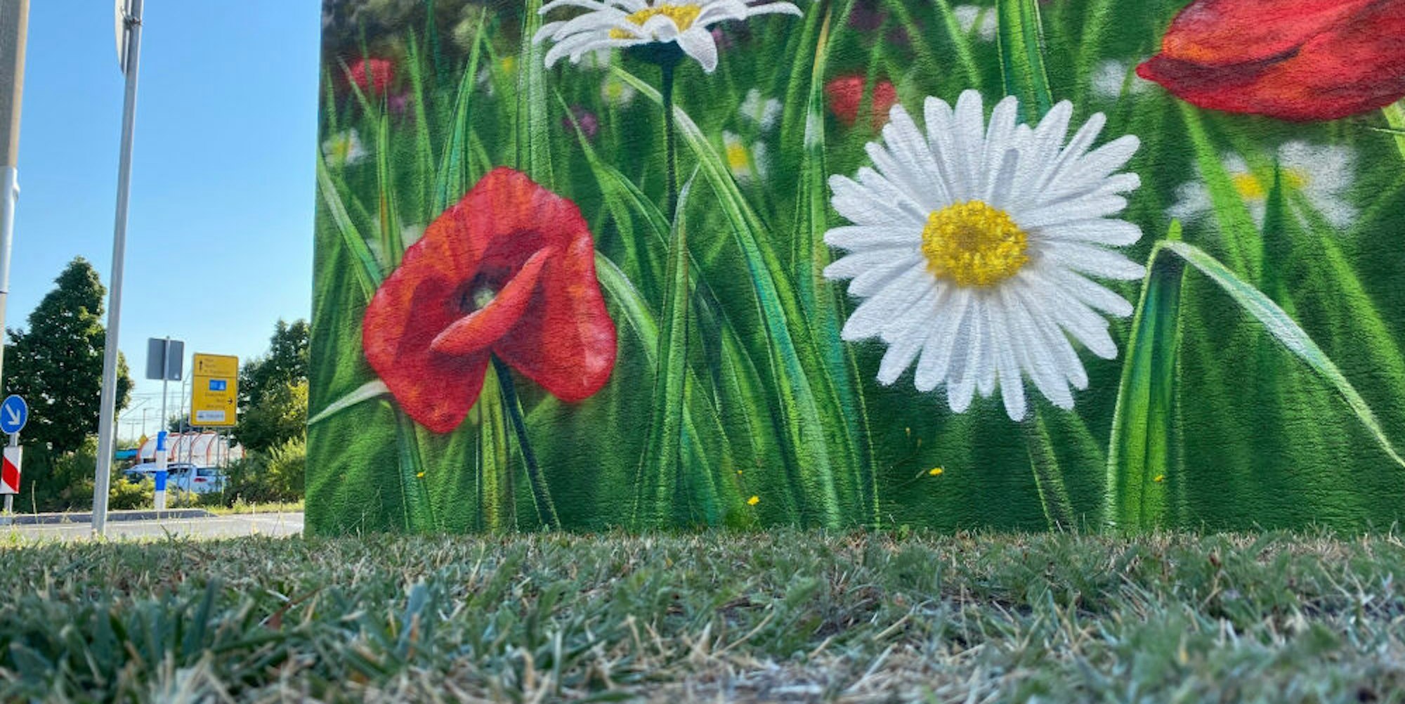 Brühl – Das Stadtgebiet ist um einige Hingucker reicher. An der Kreuzung von Alte Bohle und Neue Bohle ziert die zuvor triste Gasdruckregelstation nun das überlebensgroße Bild eines Buntspechts. Und in Vochem, wo die Hauptstraße auf die Römerstraße trifft, erschafft die neue Gestaltung der Reglerstation derzeit eine beinahe perfekte Illusion: Die aufgrund der Trockenheit der vergangenen Tage braune Rasenfläche rings um den fensterlosen Bau geht an der Fassade in eine sattgrüne, von Mohn und Gänseblümchen bestandene Wiese über.