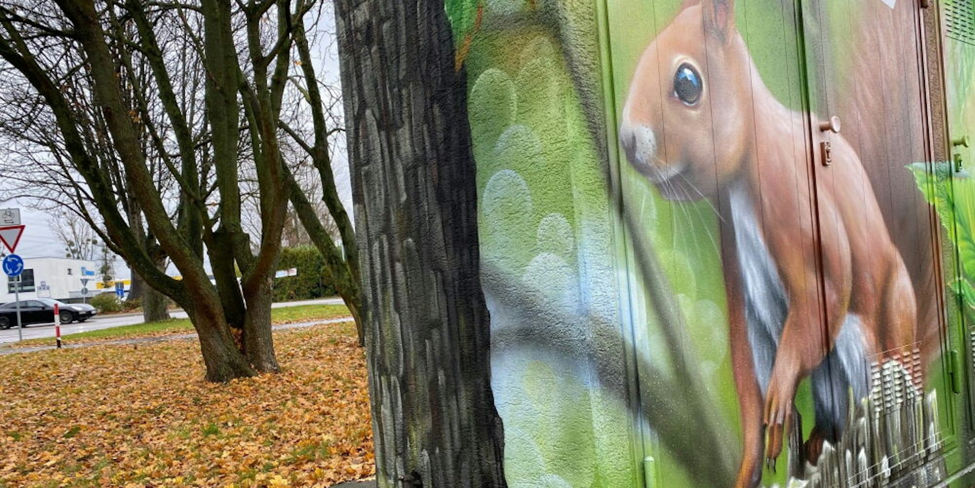 An der Schildgesstraße im Brühler Osten sind an den Mauern der dortigen zwei Trafohäuschen und einer Gasregelstation nun grüne Blätter, Eichhörnchen und eine Kohlmeise zu sehen. „Die Verschönerung der in die Jahre gekommenen Fassaden der Trafostationen war eine Idee meines Kollegen Marcel Beckmann, der für Bau- und Instandhaltung von Trafostationen zuständig ist“, erklärt Martin lösch, der sich bei den Stadtwerken um Produkte, Innovationen und Marketing kümmert. Den Künstlern aus Bonn sei ein guter Ruf vorausgeeilt.