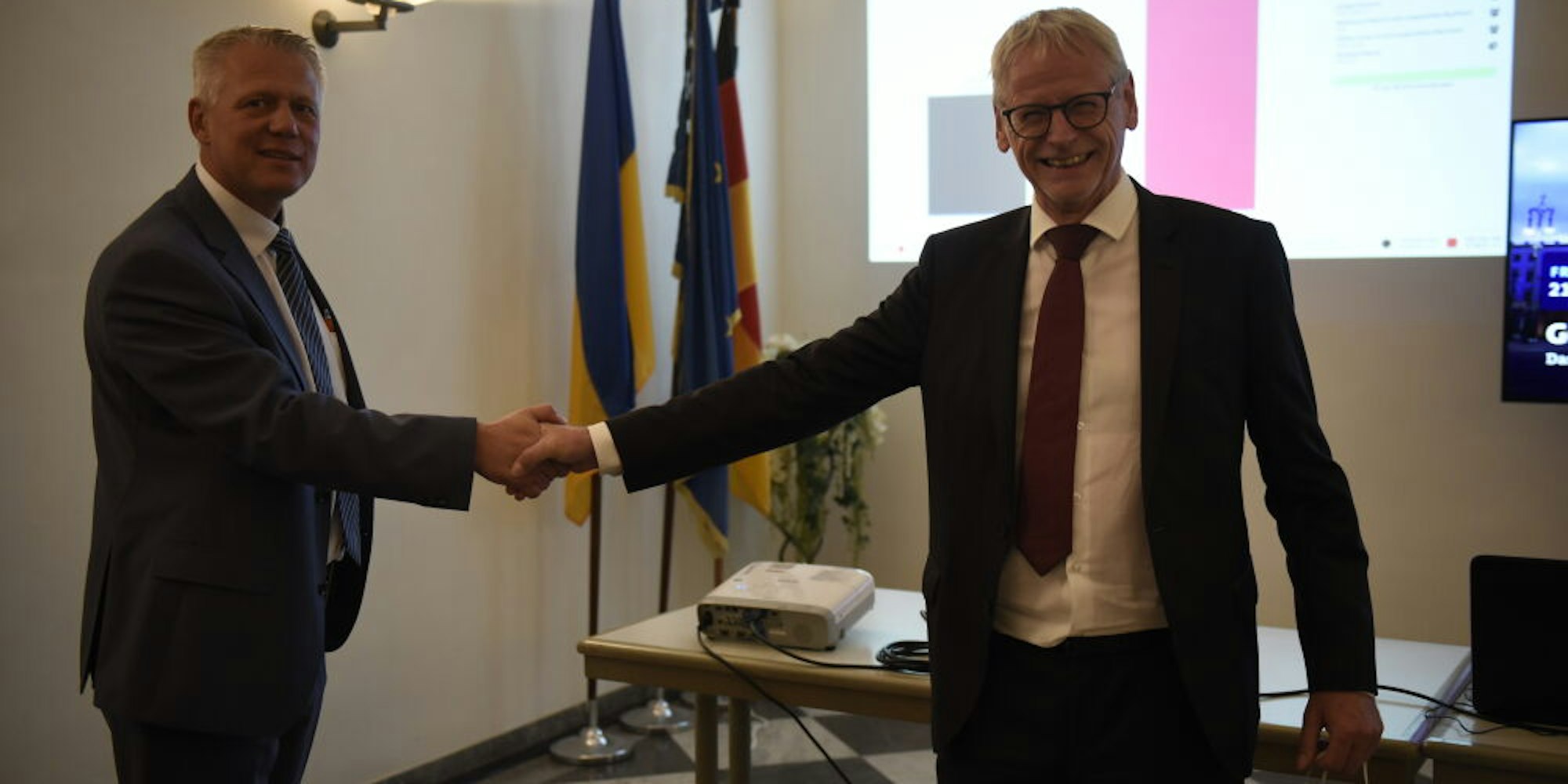 Holger Köllejan von der CDU (l.) gratuliert Amtsinhaber Dieter Freytag (SPD) zu seinem Wahlerfolg. Der Sozialdemokrat holte im zweiten Wahlgang über 65 Prozent der Stimmen.