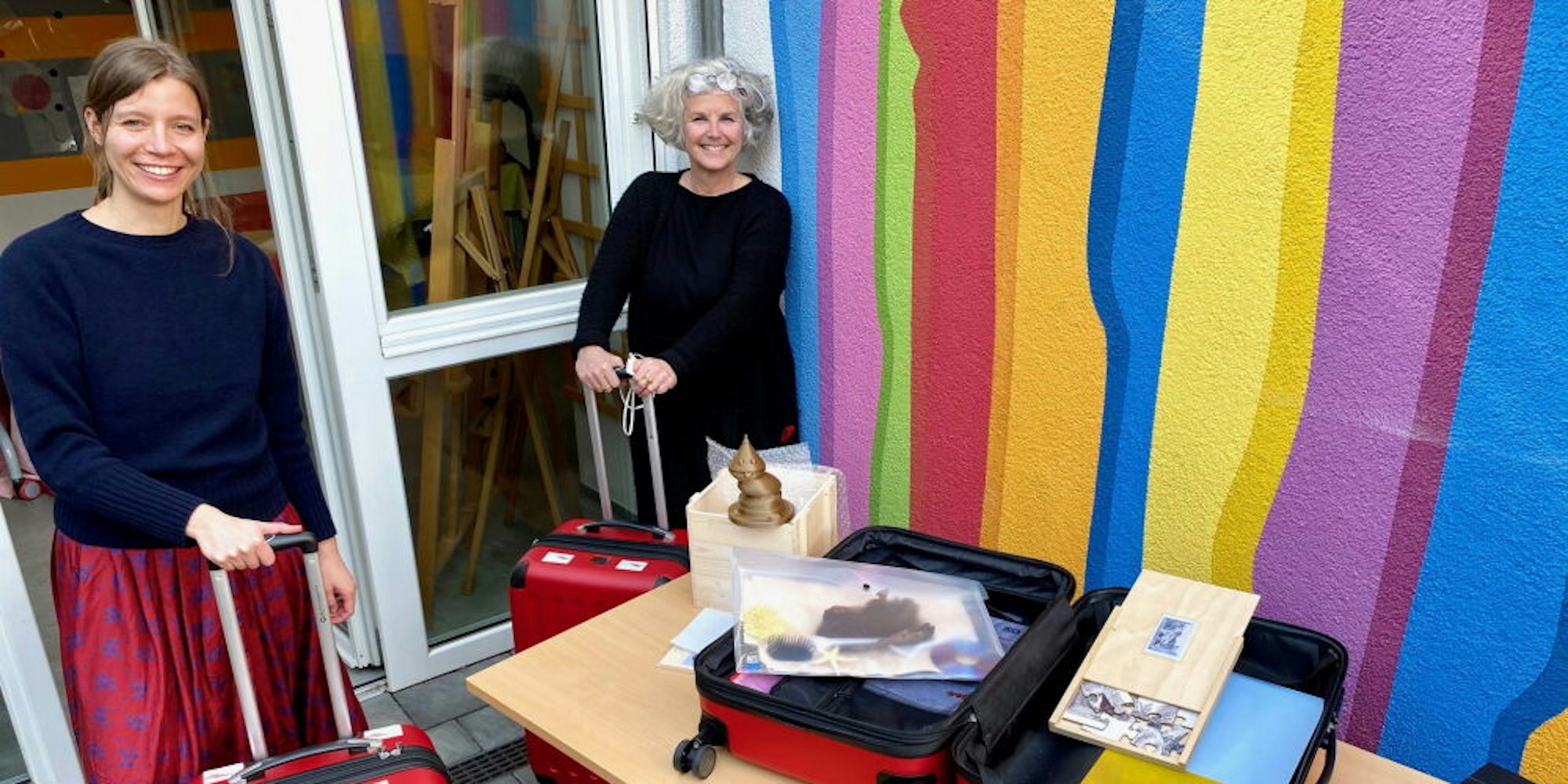 Julia Freiboth (l.) und Irmgard Schifferdecker von der Kunstvermittlung haben den Koffer gepackt.