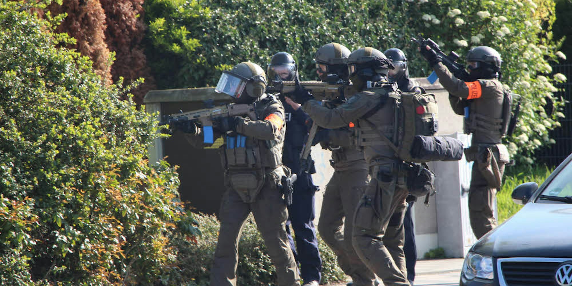 Laut „Drehbuch“ hatte es einen Notruf gegeben. Mehrere Täter mit Schusswaffen und Sprengstoff waren in die Schule eingedrungen und hatten auf Schüler und Lehrer geschossen. Wenig später näherten sich die Spezialeinsatzkräfte mit gezogenen Waffen (Farbmarkierungswaffen) und schusssicheren Westen dem Gebäude. Immer wieder waren laute Detonationen zu hören. Dichter Rauch stieg auf und erschwerte den Rettern die Sicht. Um möglichst realistisch zu arbeiten, hatten sich mehrere Beamte der Einsatzhundertschaft aus Bonn bereiterklärt, die Opfer darzustellen.