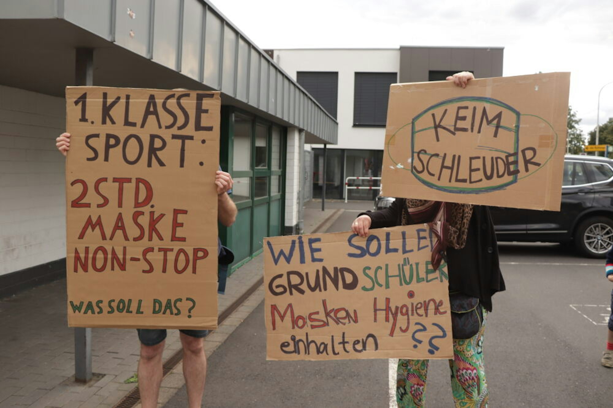 Einige Eltern erwarteten Schulministerin Yvonne Gebauer mit selbst gebastelten Plakaten. Sie kritisierten die Maskenpflicht für Schüler.