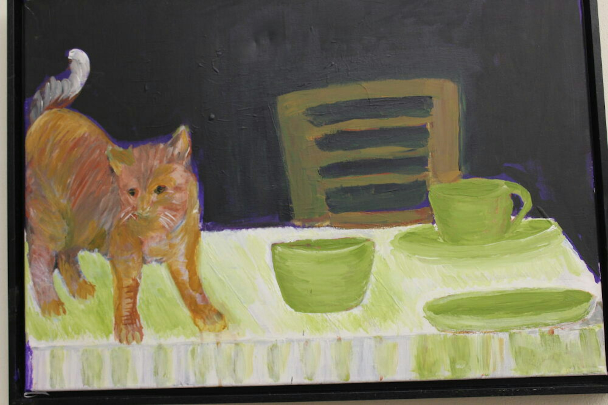 Besonders gut ist auch ein Bild gelungen, das seine Katze vor dunklem Hintergrund auf dem Kaffeetisch zeigt.