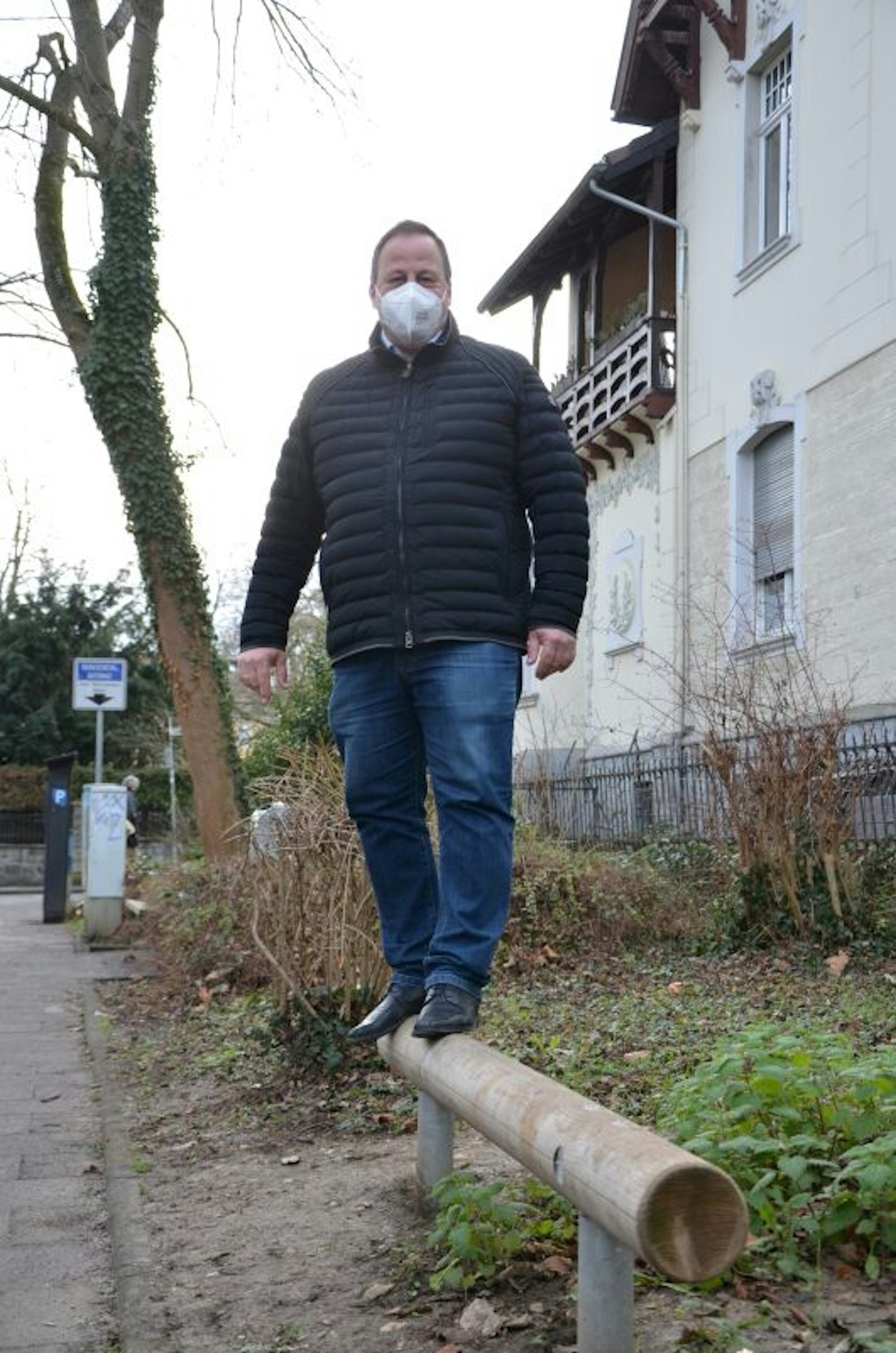 Dezernent Gerd Schiffer testet einen Balancierbalken.