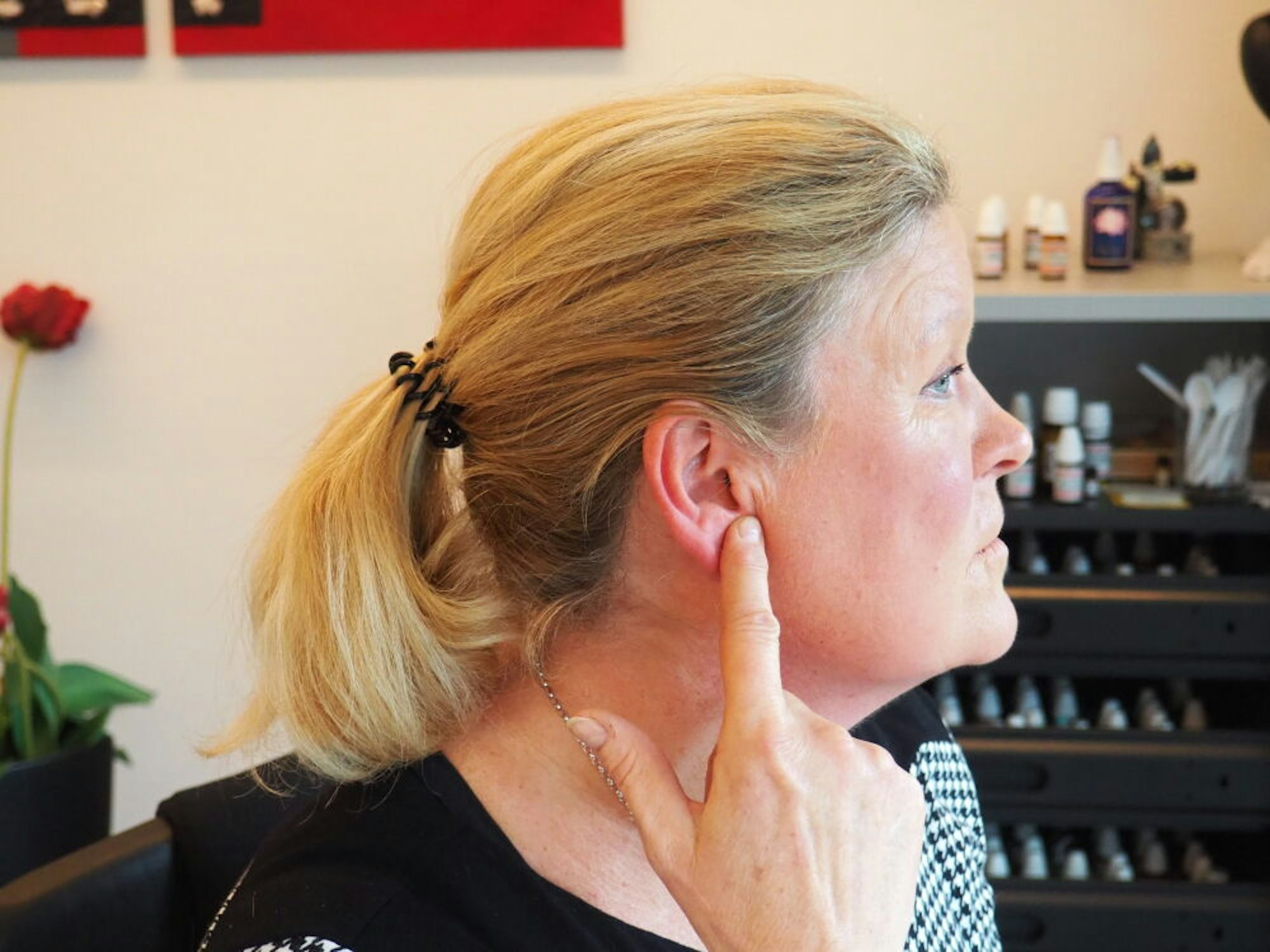 Wo die Stiche sitzen müssen, zeigt die Heilpraktikerin am eigenen Ohr und auf einer schematischen Darstellung der Akupunkturpunkte.