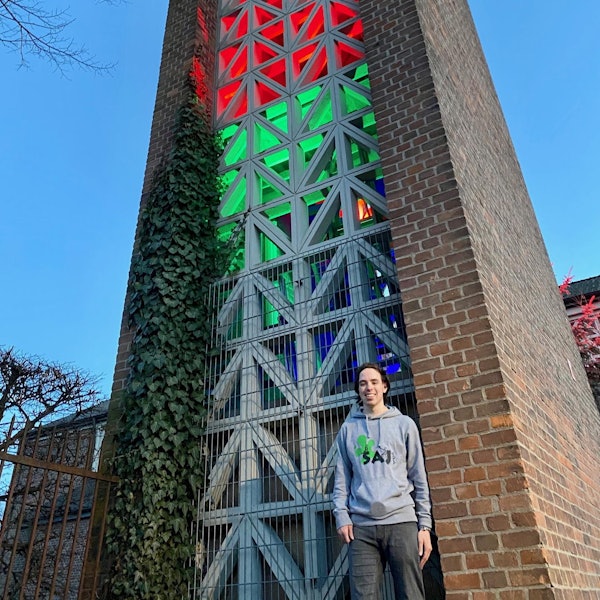 Birgit Anders, Janina Koch, Rafael Buttlies und Max Mahnig (v.l.) freuen sich über die Leuchtkraft des Glockenturms der Kirche Maria Hilf.
