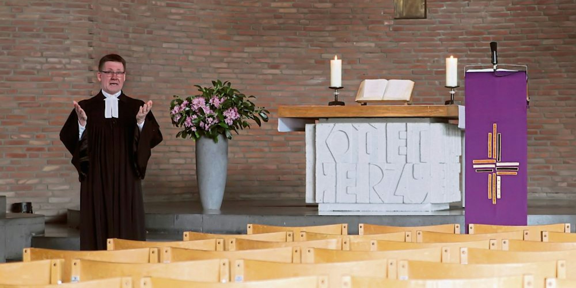 Gebet vor leeren Stuhlreihen: Pfarrer Rüdiger Penczek feierte in Wesseling einen Gottesdienst, der nur im Internet übertragen wurde.