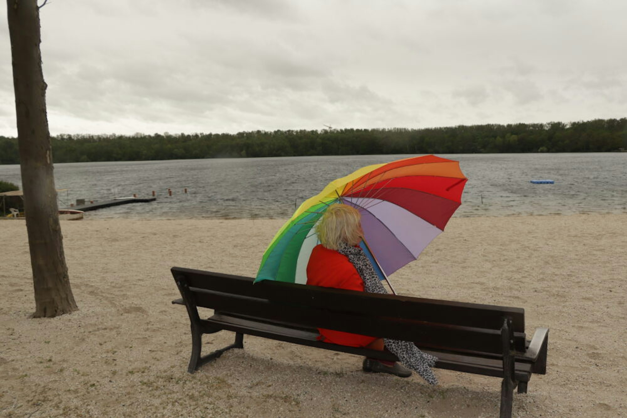 Dick eingemummelt saß auf einer Bank mit Seeblick ein Urlauber und schien geschützt unter einem bunten Regenschirm auf ein bisschen wärmeres Wetter zu warten. Ansonsten war es still auf dem See und in der Campinganlage. Nur wenige Dauercamper waren dort. Für Spontanreisende war der Campingplatz über die Pfingsttage noch geschlossen.