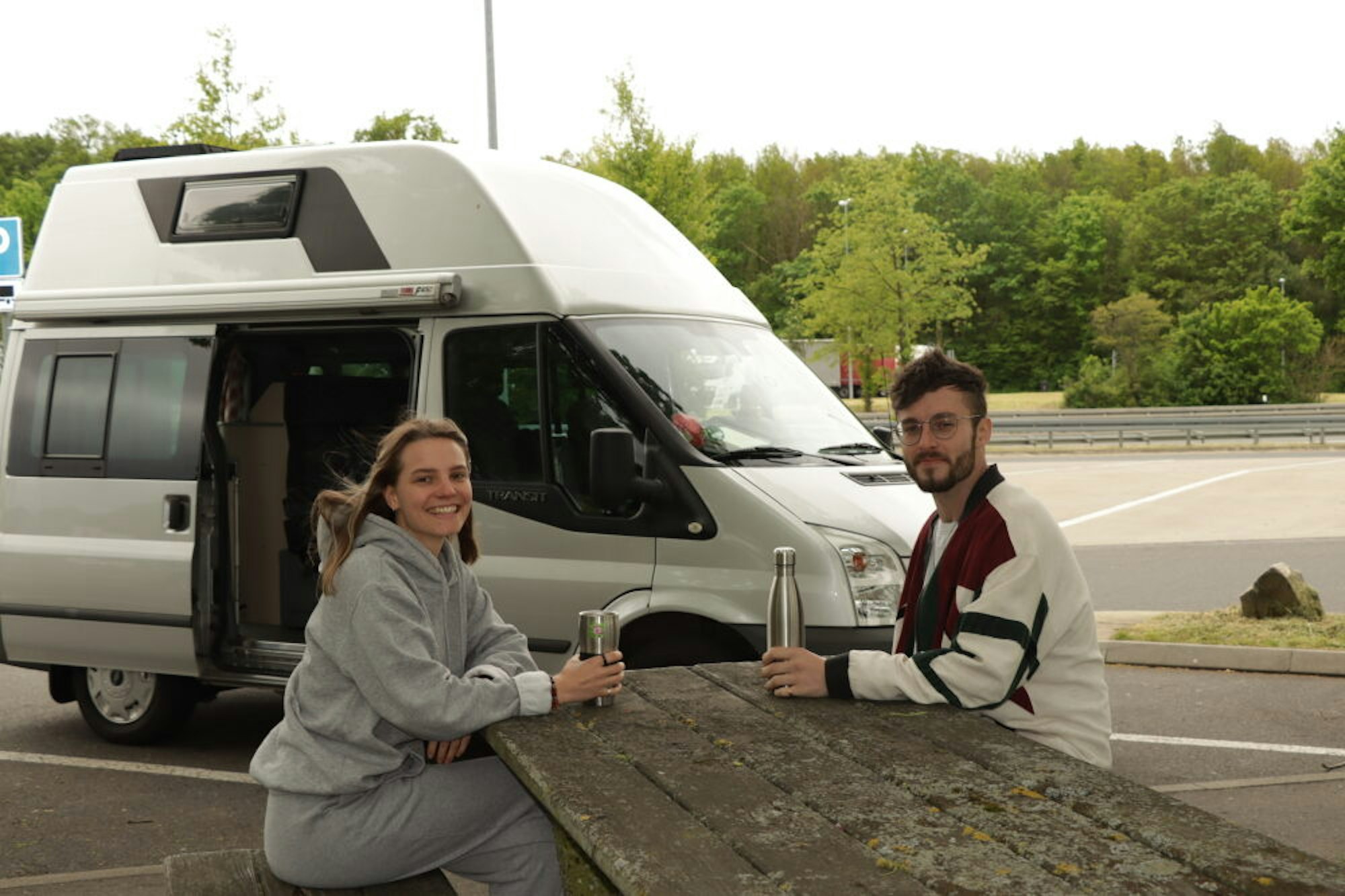 Maja Assenmacher und Robin Kühne machten auf dem Weg in die Eifel in Brühl eine Pause.