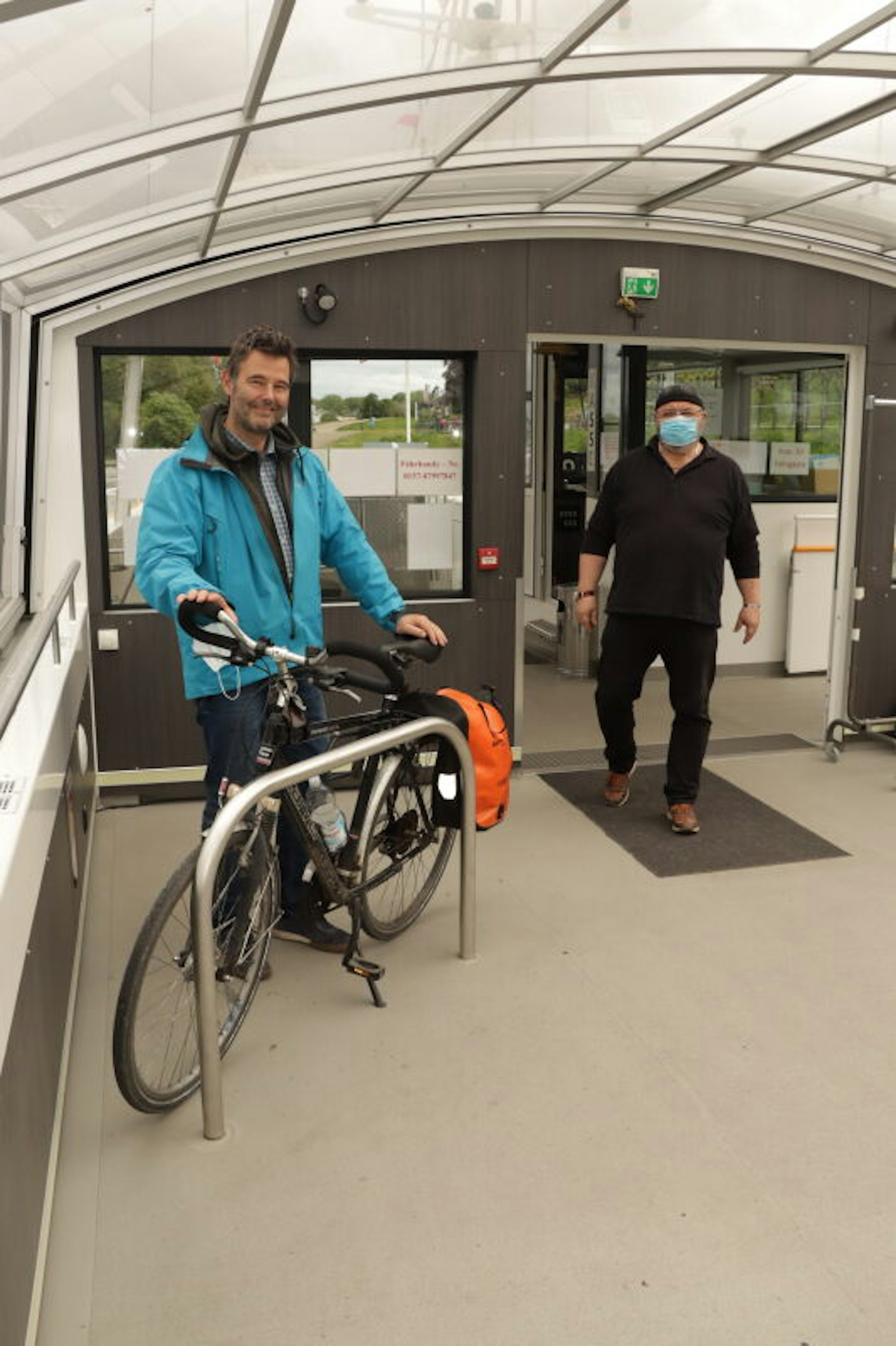 Zu einem Ausflug war Jürgen Esser mit seinem Fahrrad aufgebrochen: Nach einer Tour durchs Linksrheinische ließ er sich von Schiffsführer Lothar Gnädig auf dem Rheinschwan von Wesseling aus zurück nach Niederkassel bringen.