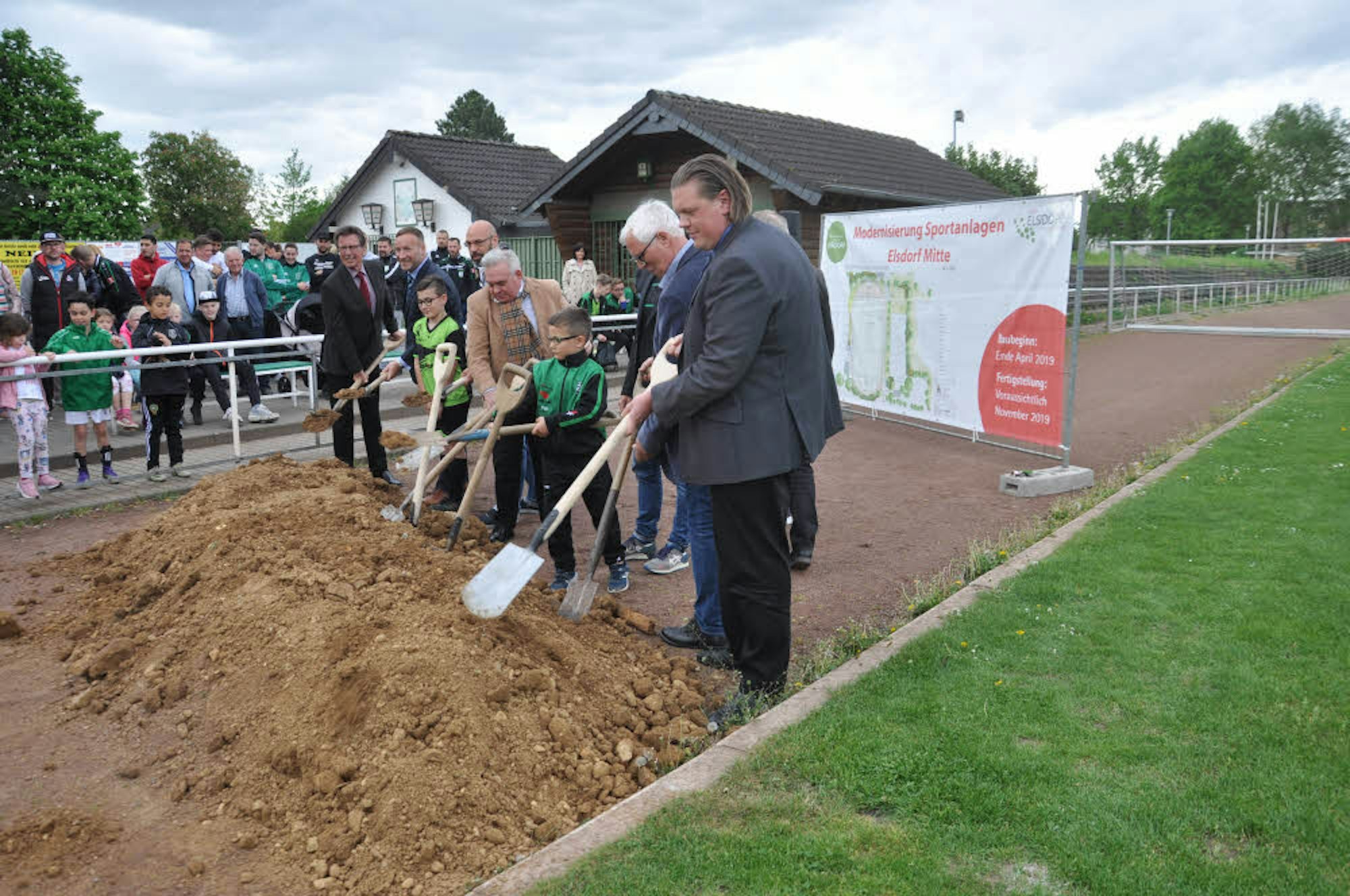 Vor vielen Zuschauern aus den Vereinen griffen die Funktionäre, Politiker, Planer, aber auch Nachwuchskicker zum Spaten und bewegten die ersten Brocken eines eigens auf der Aschenbahn gekippten Erdhaufens. Der Umbau des Stadions soll 1,8 Millionen Euro kosten.