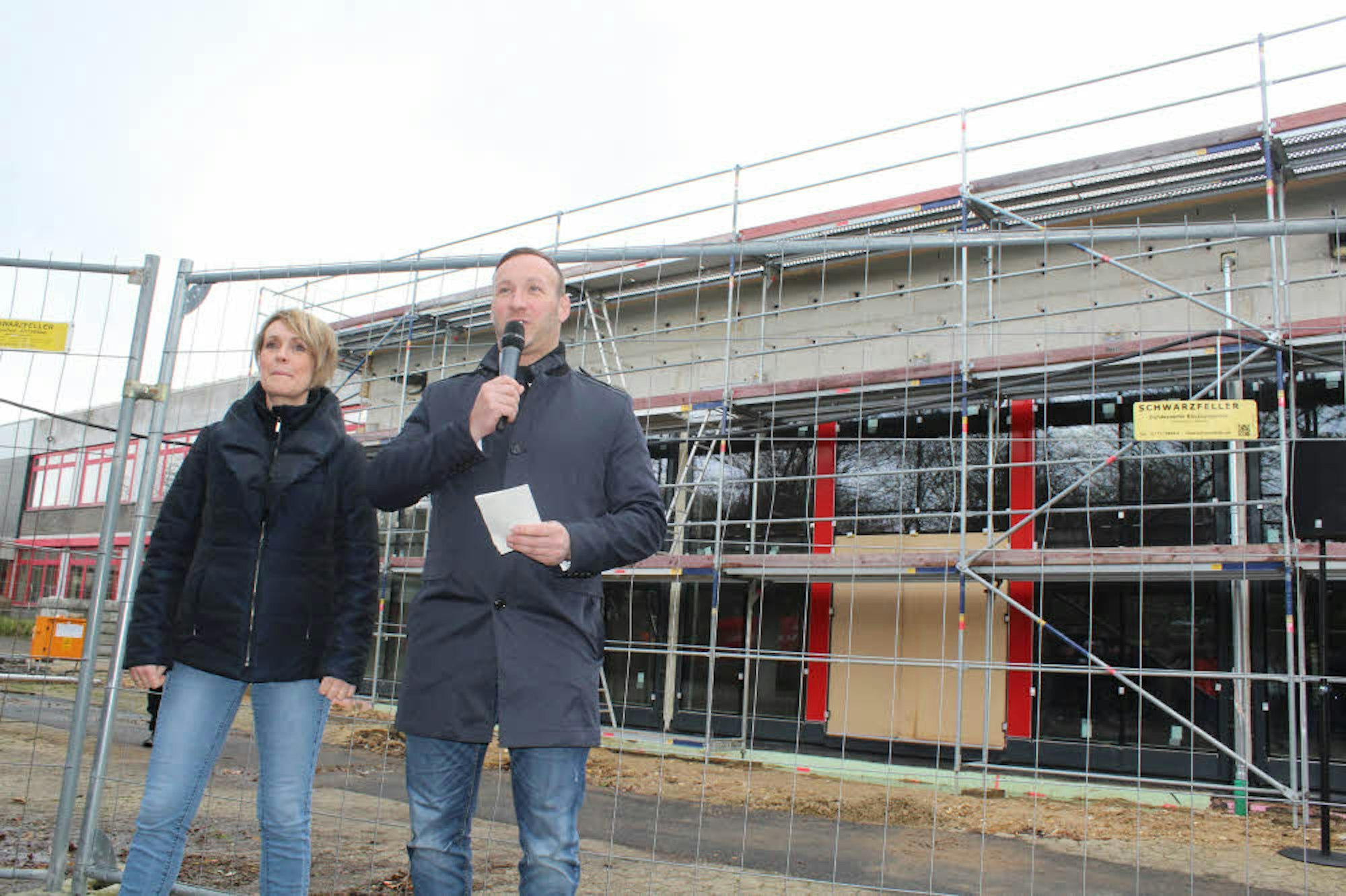 Elsdorf – Die Vorlage, die ihr Andreas Heller lieferte, nahm Christine Wingen-Pahr, Schulleiterin der Elsdorfer Gesamtschule, gleich auf. Der Bürgermeister hatte auf dem Richtfest des Neubaus am Elsdorfer Schulzentrum vor versammelter Schüler- und Lehrerschaft verkündet, dass das Gebäude Ende des ersten Quartals 2020 fertiggestellt sein solle.