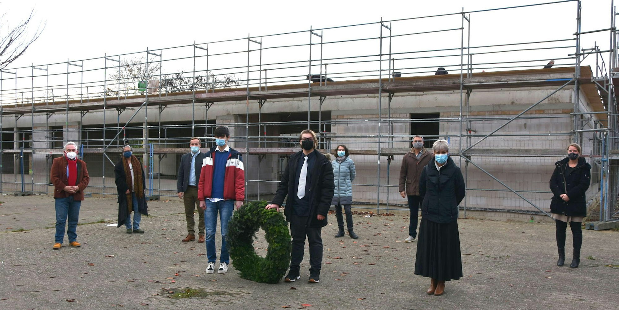 Bürgermeister Andreas Heller betonte, dass es ihm wichtig sei, „unsere Vorhaben wie geplant umzusetzen, auch wenn die Zeiten schwierig sind“. So bringe man die Stadt „auch in Krisenzeiten voran“. Er überreichte den Schülervertretern Leon Davault und Arif Eser einen grünen Kranz, der nicht als Richtkranz über dem Gebäude schwebte, sondern künftig als Adventskranz in der Schule leuchten soll.