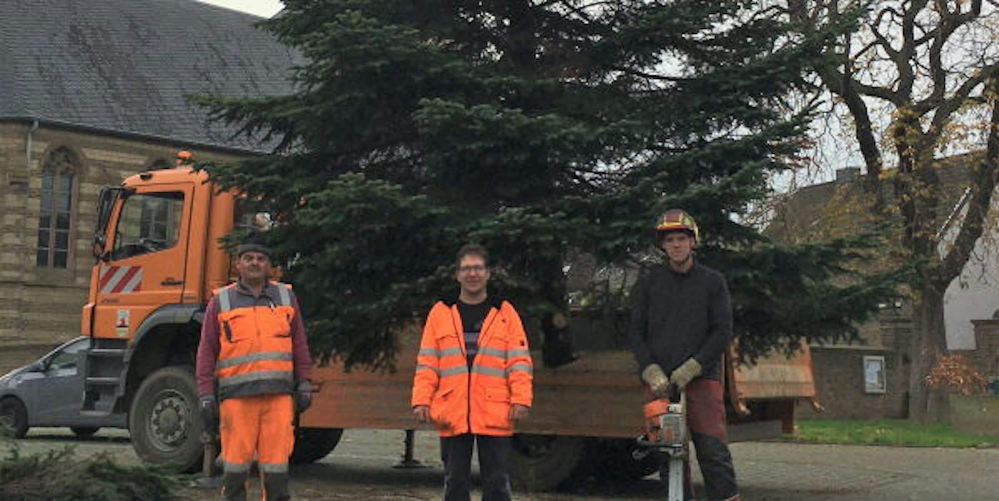 Wie hier in Heppendorf stellen die Stadtmitarbeiter Weihnachtsbäume auf.