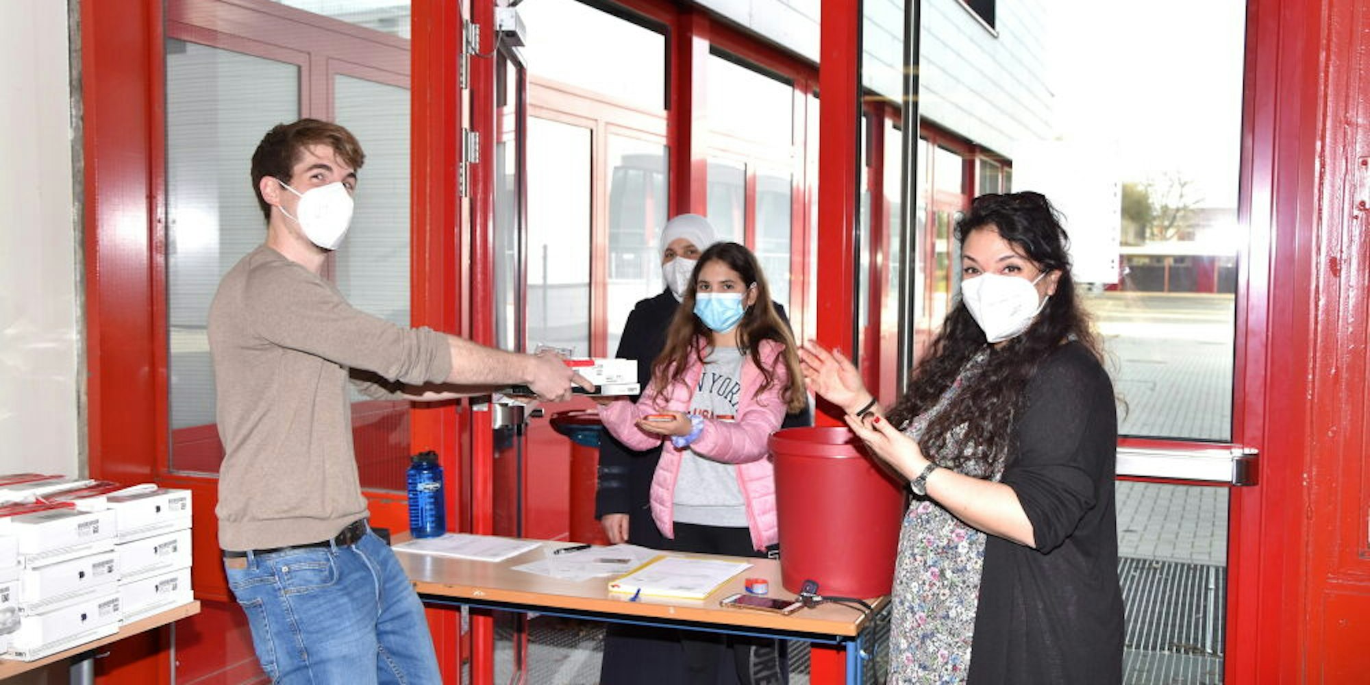 Tablet-Ausgabe an der Tür zur Gesamtschule mit den Teamleitern Kersten Hilgers und Bahara Shaihabi.