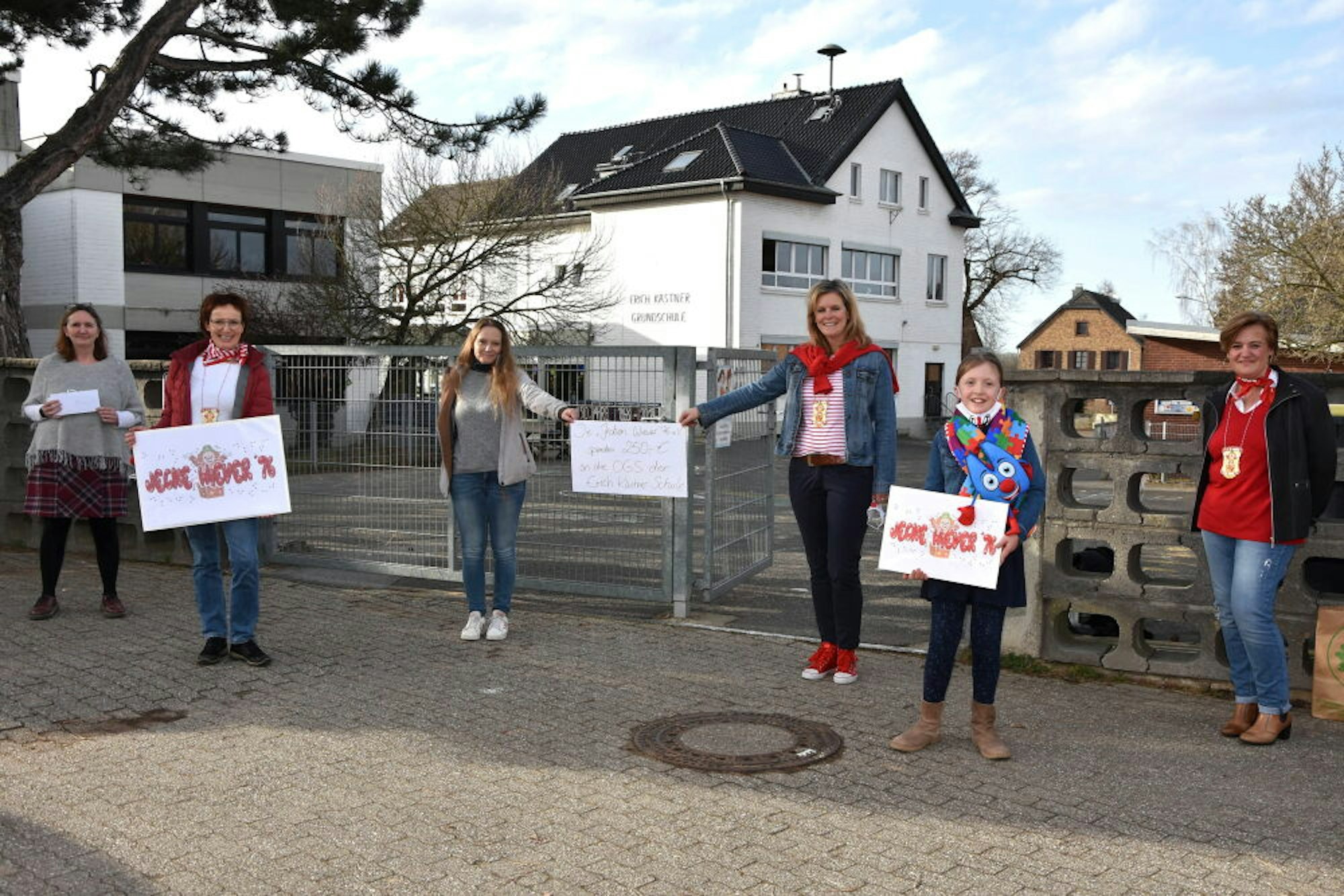 Die OGS der Grundschule mit Heike Bowles (l.) und Kerstin Malek (3.v.l.) freut sich über die Spende von (v.l.) Monika Julius, Anja und Eva Hermansen und Ellen Krieger von den Jecken Wievern.