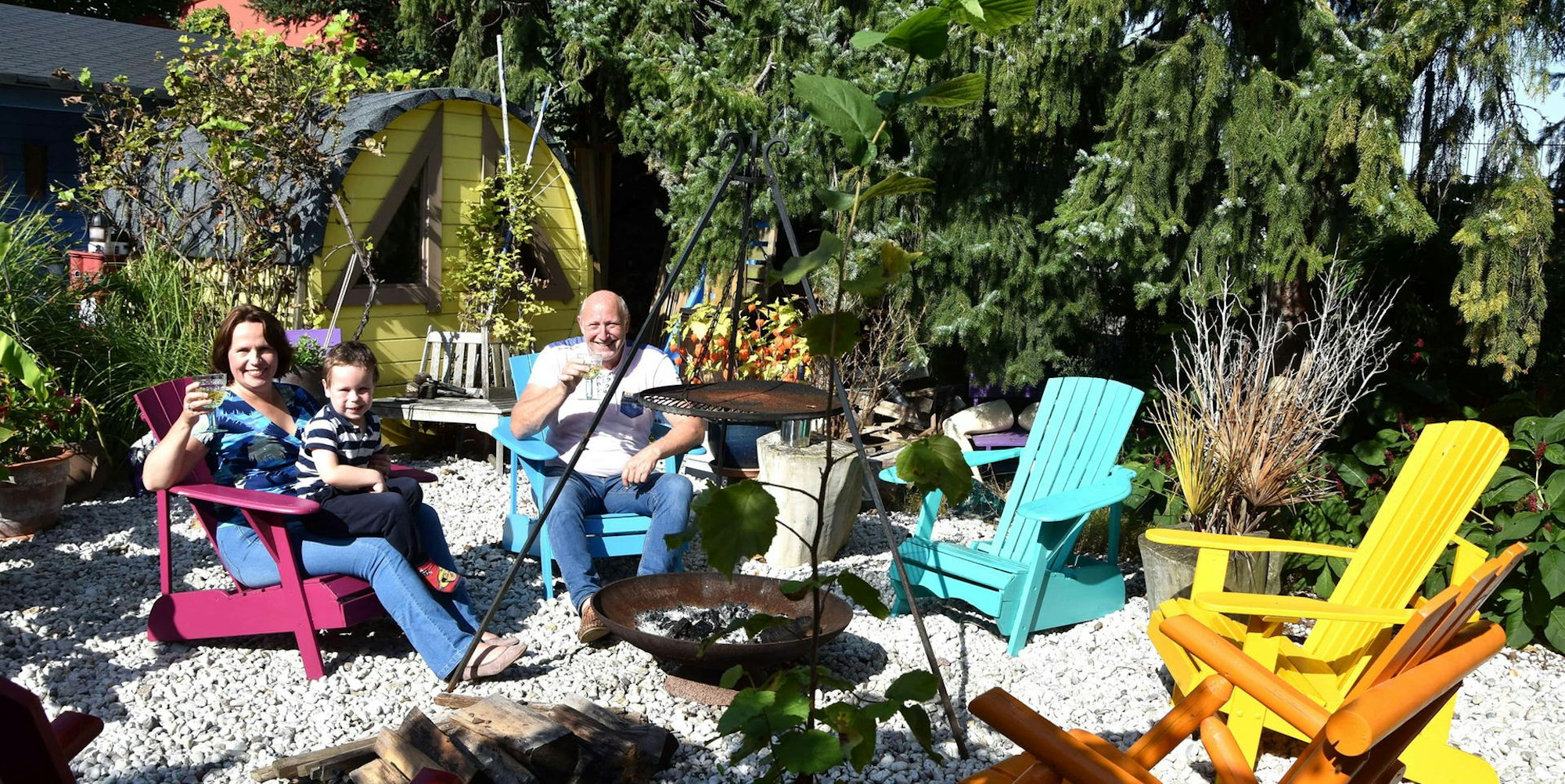Der Lieblingsplatz der Familie ist die bunte Sitzgruppe um die Feuerschale. Hier wachsen nicht nur Bananen neben dem Lagerfeuer, hier wird auch richtig gekocht. „Im Winter gab es auch schon Wirsing vom offenen Feuer“, erzählt Bussmann. „Wir wählen je nach Wetter, Sonnenstand und Laune aus, wo wir uns hinsetzen“, sagt Susanne Sarlette.